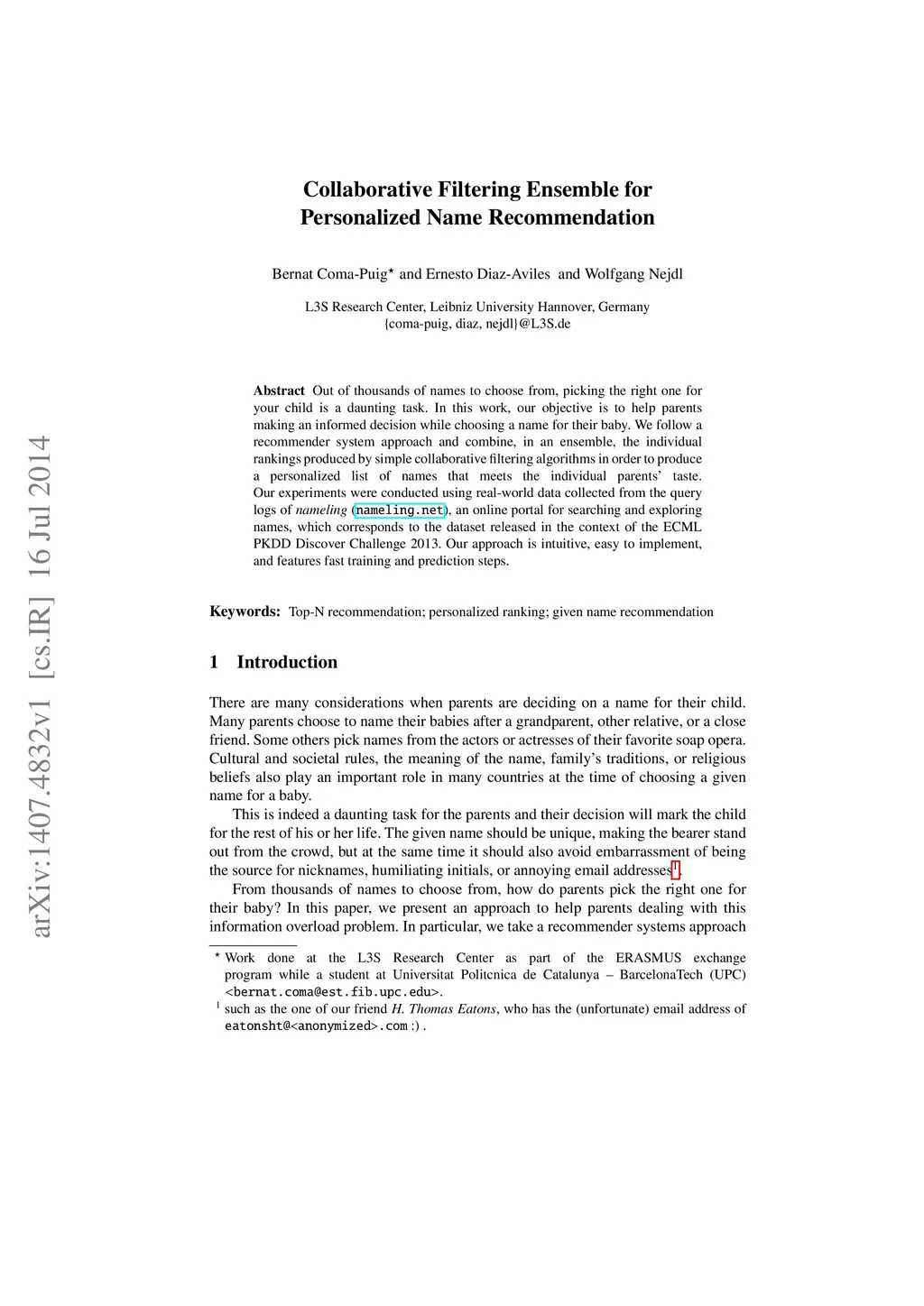 Out of thousands of names to choose from, picking the right one for your child is a daunting task. In this work, our objective is to help parents making an informed decision while choosing a name for their baby. We follow a recommender system approach and combine, in an ensemble, the individual rankings produced by simple collaborative filtering algorithms in order to produce a personalized list of names that meets the individual parents' taste. Our experiments were conducted using real-world data collected from the query logs of ñameling' (nameling.net), an online portal for searching and exploring names, which corresponds to the dataset released in the context of the ECML PKDD Discover Challenge 2013. Our approach is intuitive, easy to implement, and features fast training and prediction steps.