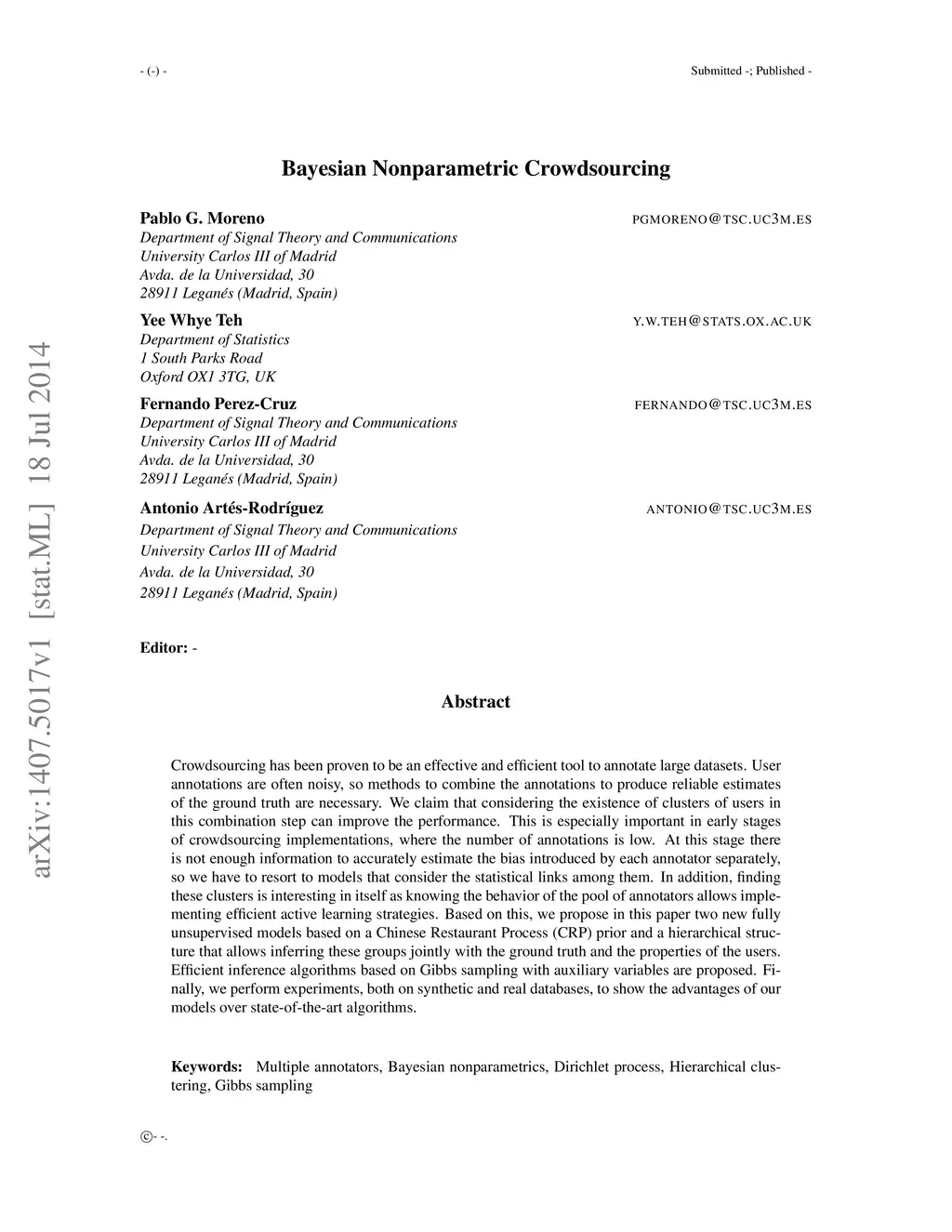 Crowdsourcing has been proven to be an effective and efficient tool to annotate large datasets. User annotations are often noisy, so methods to combine the annotations to produce reliable estimates of the ground truth are necessary. We claim that considering the existence of clusters of users in this combination step can improve the performance. This is especially important in early stages of crowdsourcing implementations, where the number of annotations is low. At this stage there is not enough information to accurately estimate the bias introduced by each annotator separately, so we have to resort to models that consider the statistical links among them. In addition, finding these clusters is interesting in itself as knowing the behavior of the pool of annotators allows implementing efficient active learning strategies. Based on this, we propose in this paper two new fully unsupervised models based on a Chinese Restaurant Process (CRP) prior and a hierarchical structure that allows inferring these groups jointly with the ground truth and the properties of the users. Efficient inference algorithms based on Gibbs sampling with auxiliary variables are proposed. Finally, we perform experiments, both on synthetic and real databases, to show the advantages of our models over state-of-the-art algorithms.