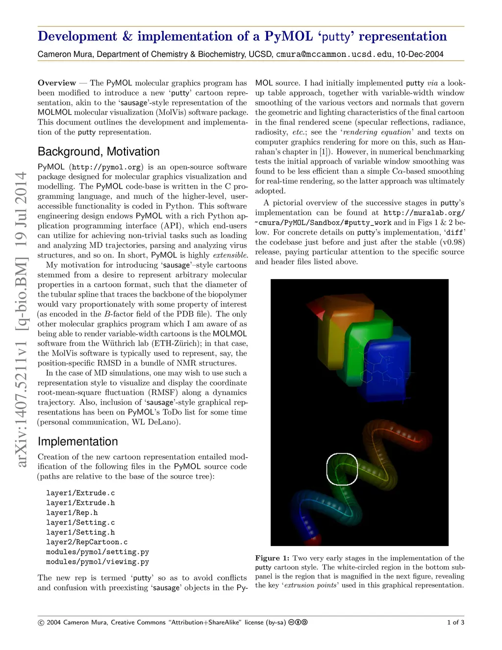 The PyMOL molecular graphics program has been modified to introduce a new 'putty' cartoon representation, akin to the 'sausage'-style representation of the MOLMOL molecular visualization (MolVis) software package. This document outlines the development and implementation of the putty representation.