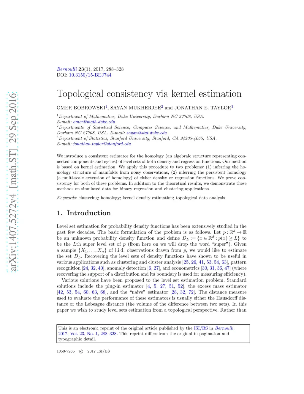 We introduce a consistent estimator for the homology (an algebraic structure representing connected components and cycles) of level sets of both density and regression functions. Our method is based on kernel estimation. We apply this procedure to two problems: (1) inferring the homology structure of manifolds from noisy observations, (2) inferring the persistent homology (a multi-scale extension of homology) of either density or regression functions. We prove consistency for both of these problems. In addition to the theoretical results, we demonstrate these methods on simulated data for binary regression and clustering applications.