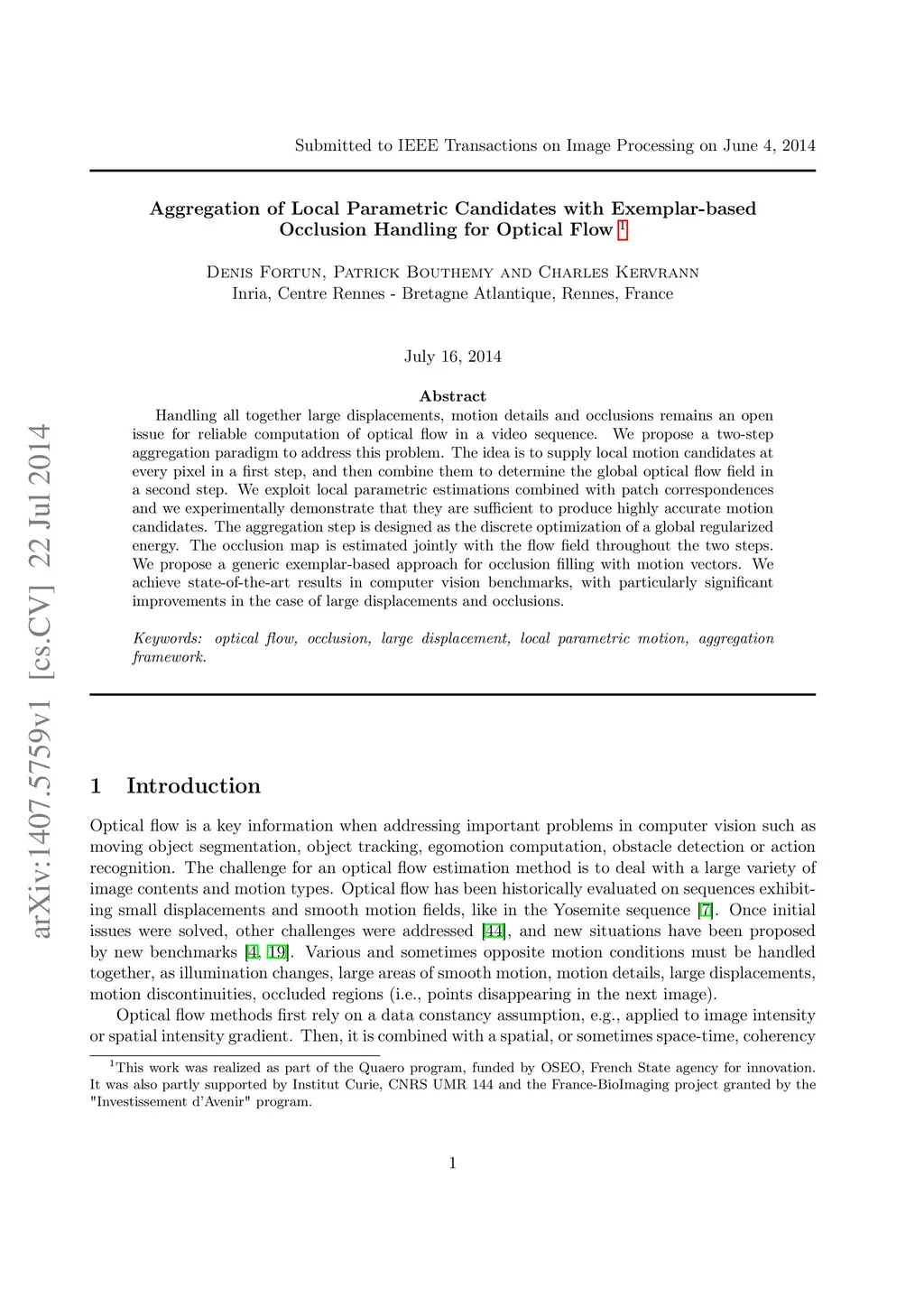 Handling all together large displacements, motion details and occlusions remains an open issue for reliable computation of optical flow in a video sequence. We propose a two-step aggregation paradigm to address this problem. The idea is to supply local motion candidates at every pixel in a first step, and then to combine them to determine the global optical flow field in a second step. We exploit local parametric estimations combined with patch correspondences and we experimentally demonstrate that they are sufficient to produce highly accurate motion candidates. The aggregation step is designed as the discrete optimization of a global regularized energy. The occlusion map is estimated jointly with the flow field throughout the two steps. We propose a generic exemplar-based approach for occlusion filling with motion vectors. We achieve state-of-the-art results in computer vision benchmarks, with particularly significant improvements in the case of large displacements and occlusions.