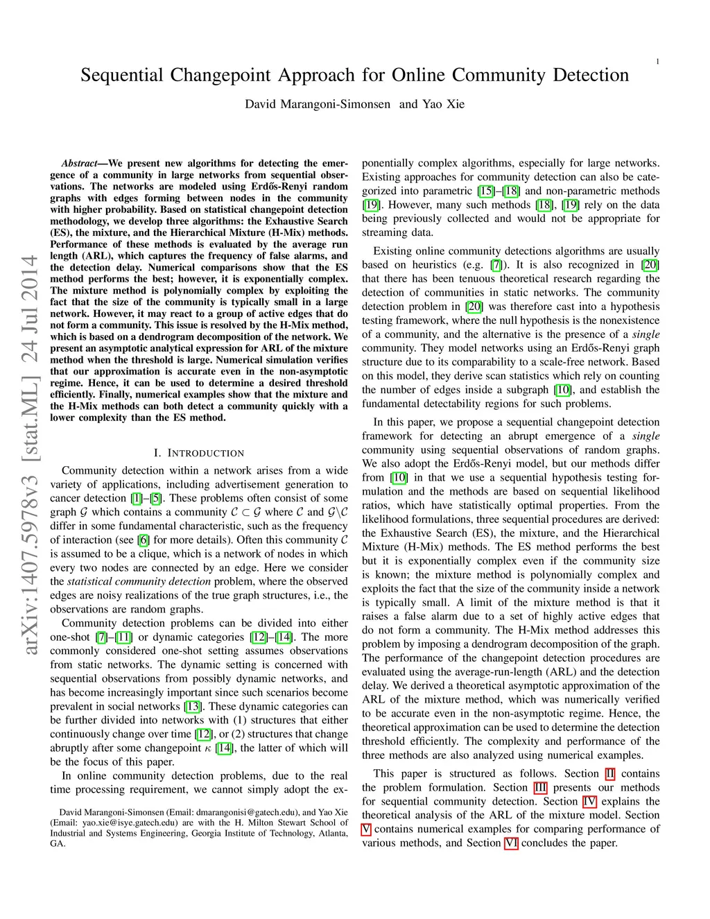 We present new algorithms for detecting the emergence of a community in large networks from sequential observations. The networks are modeled using Erdos-Renyi random graphs with edges forming between nodes in the community with higher probability. Based on statistical changepoint detection methodology, we develop three algorithms: the Exhaustive Search (ES), the mixture, and the Hierarchical Mixture (H-Mix) methods. Performance of these methods is evaluated by the average run length (ARL), which captures the frequency of false alarms, and the detection delay. Numerical comparisons show that the ES method performs the best; however, it is exponentially complex. The mixture method is polynomially complex by exploiting the fact that the size of the community is typically small in a large network. However, it may react to a group of active edges that do not form a community. This issue is resolved by the H-Mix method, which is based on a dendrogram decomposition of the network. We present an asymptotic analytical expression for ARL of the mixture method when the threshold is large. Numerical simulation verifies that our approximation is accurate even in the non-asymptotic regime. Hence, it can be used to determine a desired threshold efficiently. Finally, numerical examples show that the mixture and the H-Mix methods can both detect a community quickly with a lower complexity than the ES method.