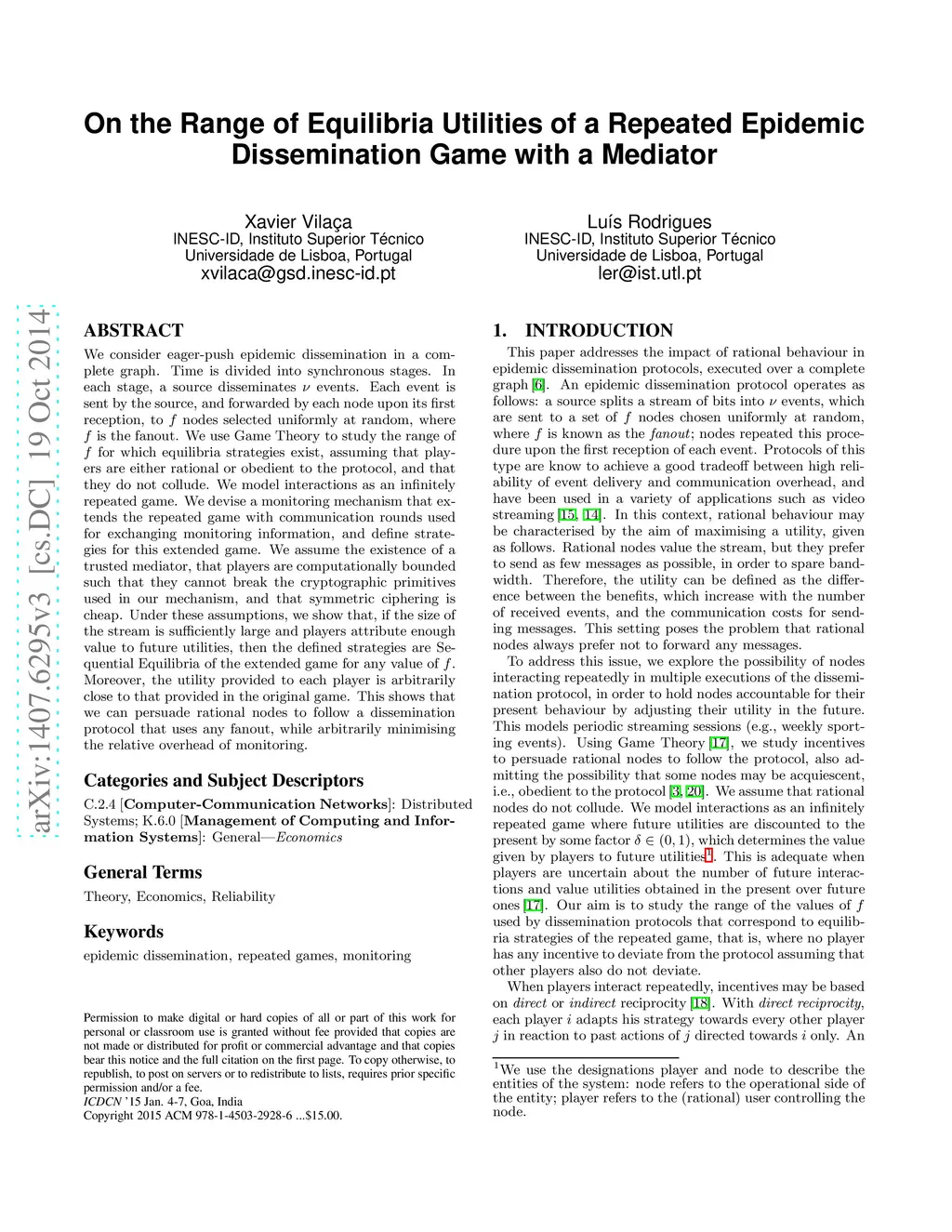 We consider eager-push epidemic dissemination in a complete graph. Time is divided into synchronous stages. In each stage, a source disseminates events. Each event is sent by the source, and forwarded by each node upon its first reception, to nodes selected uniformly at random, where is the fanout. We use Game Theory to study the range of for which equilibria strategies exist, assuming that players are either rational or obedient to the protocol, and that they do not collude. We model interactions as an infinitely repeated game. We devise a monitoring mechanism that extends the repeated game with communication rounds used for exchanging monitoring information, and define strategies for this extended game. We assume the existence of a trusted mediator, that players are computationally bounded such that they cannot break the cryptographic primitives used in our mechanism, and that symmetric ciphering is cheap. Under these assumptions, we show that, if the size of the stream is sufficiently large and players attribute enough value to future utilities, then the defined strategies are Sequential Equilibria of the extended game for any value of . Moreover, the utility provided to each player is arbitrarily close to that provided in the original game. This shows that we can persuade rational nodes to follow a dissemination protocol that uses any fanout, while arbitrarily minimising the relative overhead of monitoring.