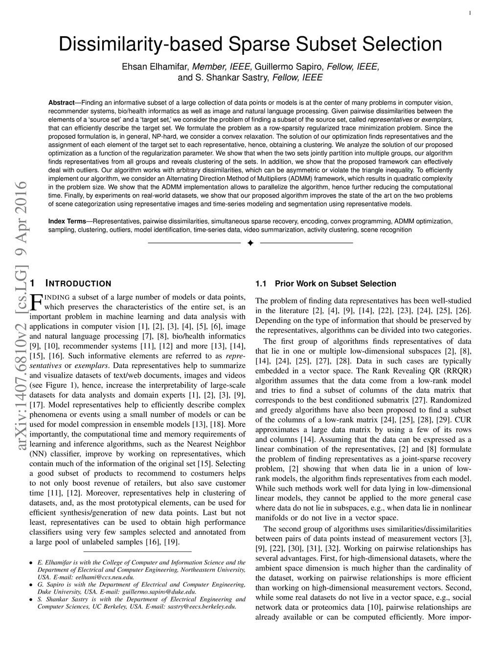 Finding an informative subset of a large collection of data points or models is at the center of many problems in computer vision, recommender systems, bio/health informatics as well as image and natural language processing. Given pairwise dissimilarities between the elements of a `source set' and a `target set,' we consider the problem of finding a subset of the source set, called representatives or exemplars, that can efficiently describe the target set. We formulate the problem as a row-sparsity regularized trace minimization problem. Since the proposed formulation is, in general, NP-hard, we consider a convex relaxation. The solution of our optimization finds representatives and the assignment of each element of the target set to each representative, hence, obtaining a clustering. We analyze the solution of our proposed optimization as a function of the regularization parameter. We show that when the two sets jointly partition into multiple groups, our algorithm finds representatives from all groups and reveals clustering of the sets. In addition, we show that the proposed framework can effectively deal with outliers. Our algorithm works with arbitrary dissimilarities, which can be asymmetric or violate the triangle inequality. To efficiently implement our algorithm, we consider an Alternating Direction Method of Multipliers (ADMM) framework, which results in quadratic complexity in the problem size. We show that the ADMM implementation allows to parallelize the algorithm, hence further reducing the computational time. Finally, by experiments on real-world datasets, we show that our proposed algorithm improves the state of the art on the two problems of scene categorization using representative images and time-series modeling and segmentation using representative~models.