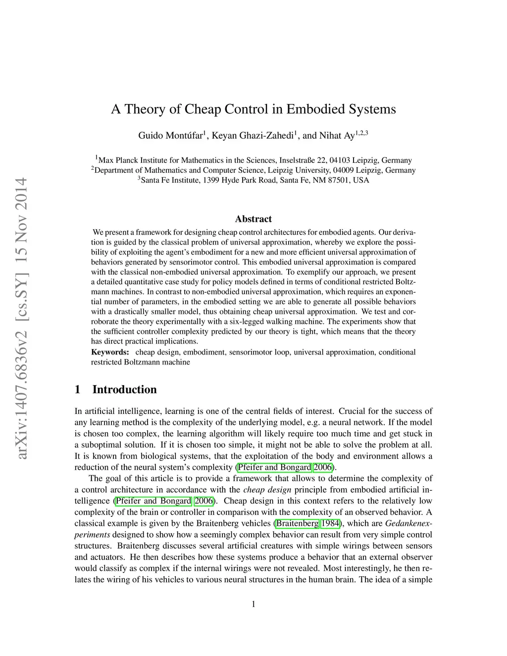 We present a framework for designing cheap control architectures for embodied agents. Our derivation is guided by the classical problem of universal approximation, whereby we explore the possibility of exploiting the agent's embodiment for a new and more efficient universal approximation of behaviors generated by sensorimotor control. This embodied universal approximation is compared with the classical non-embodied universal approximation. To exemplify our approach, we present a detailed quantitative case study for policy models defined in terms of conditional restricted Boltzmann machines. In contrast to non-embodied universal approximation, which requires an exponential number of parameters, in the embodied setting we are able to generate all possible behaviors with a drastically smaller model, thus obtaining cheap universal approximation. We test and corroborate the theory experimentally with a six-legged walking machine. The experiments show that the sufficient controller complexity predicted by our theory is tight, which means that the theory has direct practical implications. Keywords: cheap design, embodiment, sensorimotor loop, universal approximation, conditional restricted Boltzmann machine