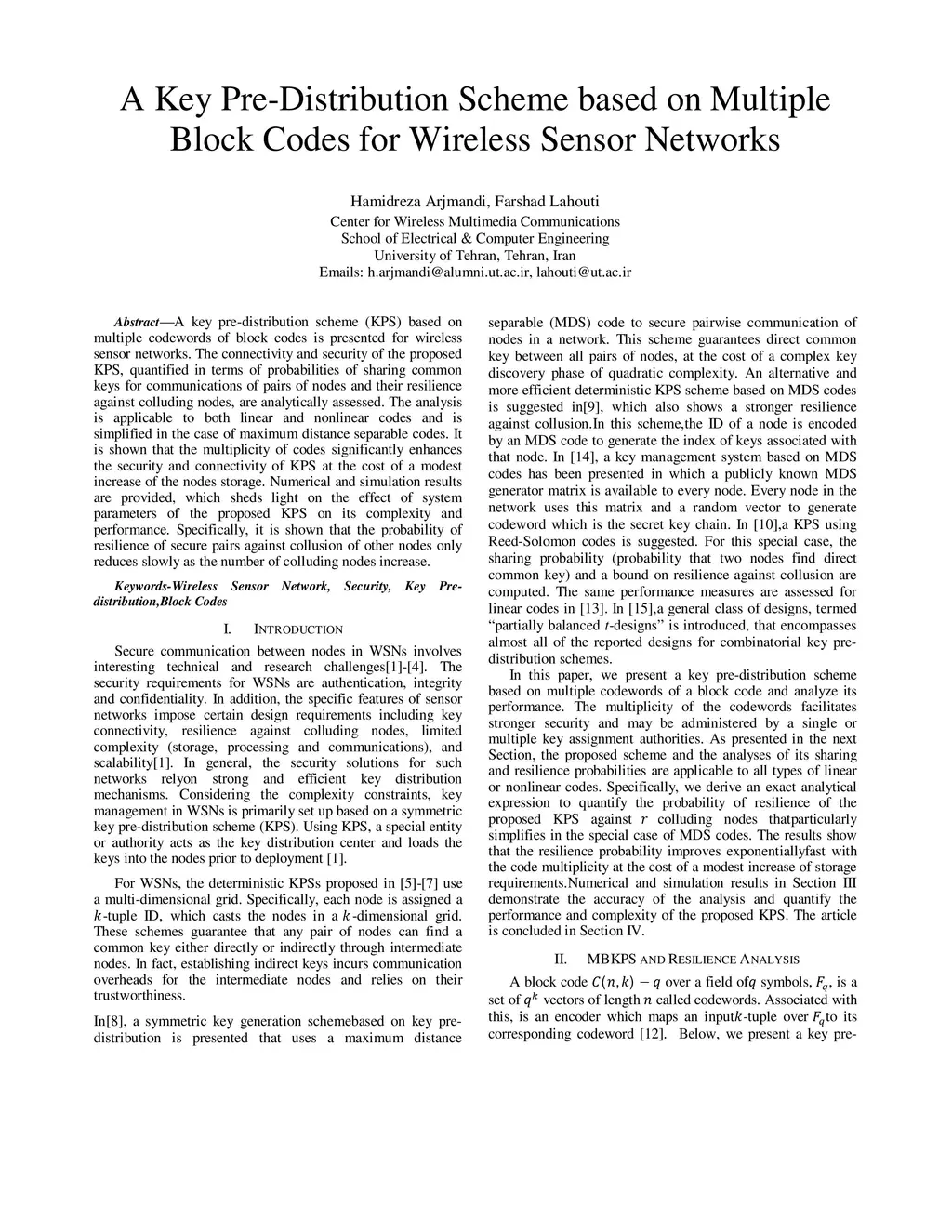 A key pre-distribution scheme (KPS) based on multiple codewords of block codes is presented for wireless sensor networks. The connectivity and security of the proposed KPS, quantified in terms of probabilities of sharing common keys for communications of pairs of nodes and their resilience against colluding nodes, are analytically assessed. The analysis is applicable to both linear and nonlinear codes and is simplified in the case of maximum distance separable codes. It is shown that the multiplicity of codes significantly enhances the security and connectivity of KPS at the cost of a modest increase of the nodes storage. Numerical and simulation results are provided, which sheds light on the effect of system parameters of the proposed KPS on its complexity and performance. Specifically, it is shown that the probability of resilience of secure pairs against collusion of other nodes only reduces slowly as the number of colluding nodes increase.