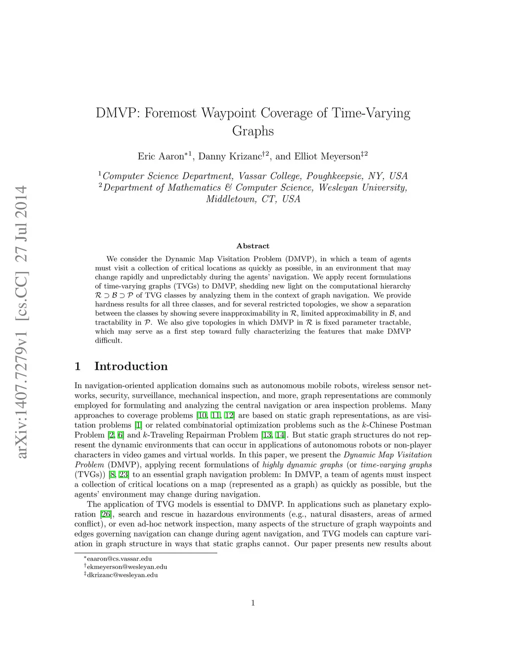 DMVP: Foremost Waypoint Coverage of Time-Varying Graphs