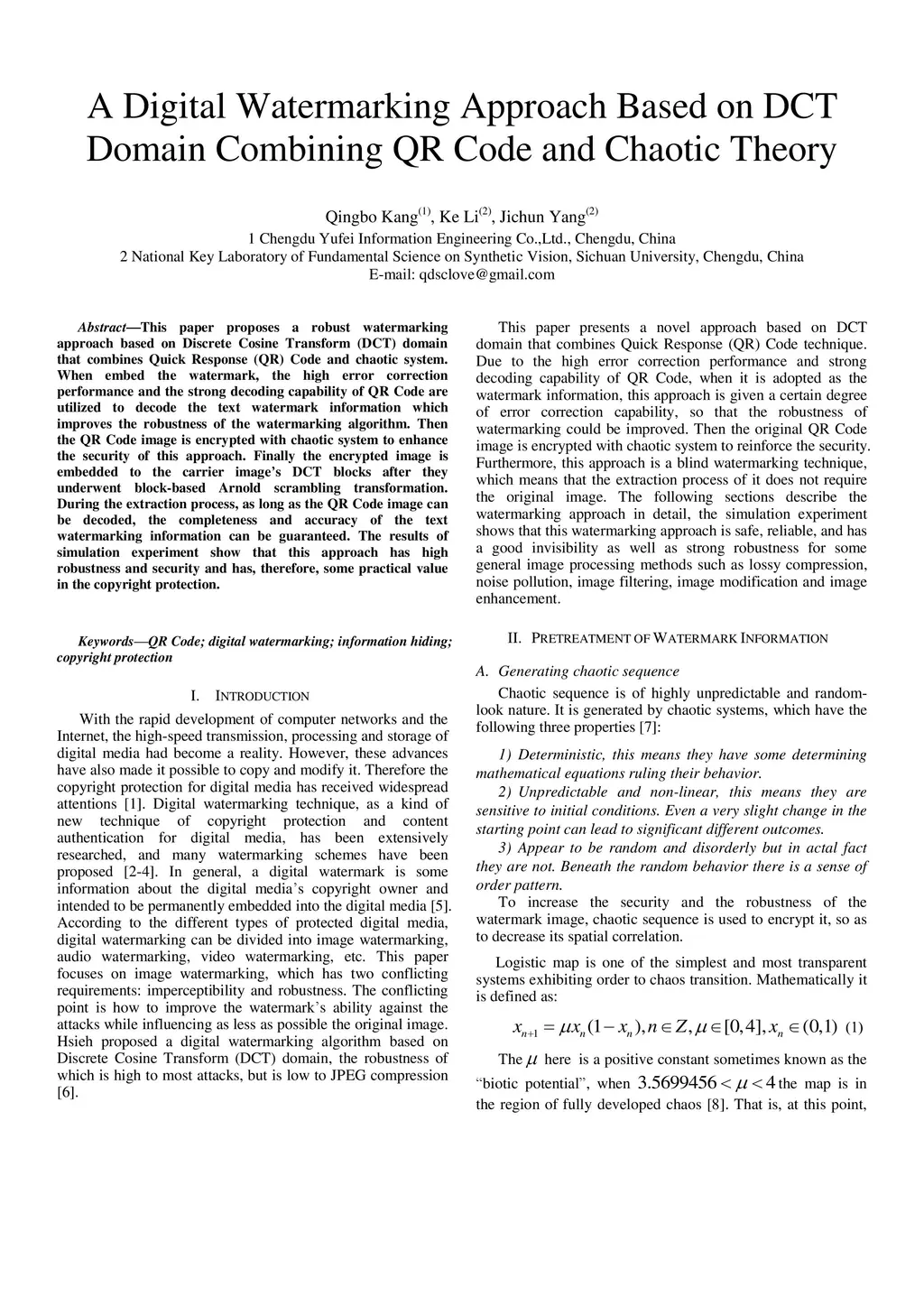 This paper proposes a robust watermarking approach based on Discrete Cosine Transform domain that combines Quick Response Code and chaotic system.