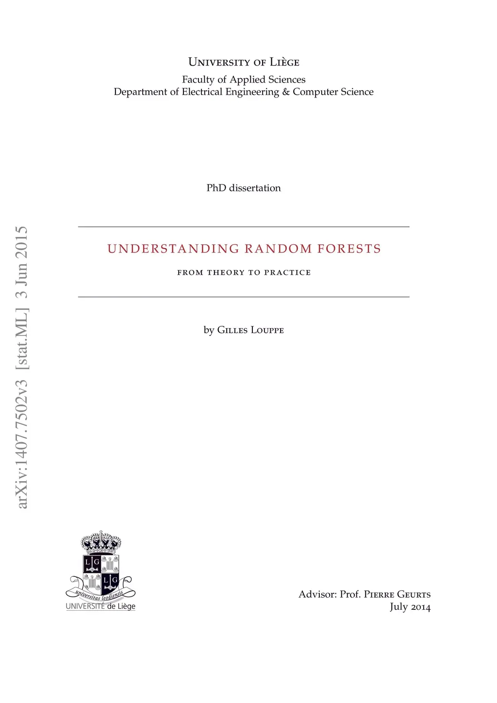Data analysis and machine learning have become an integrative part of the modern scientific methodology, offering automated procedures for the prediction of a phenomenon based on past observations, unraveling underlying patterns in data and providing insights about the problem. Yet, caution should avoid using machine learning as a black-box tool, but rather consider it as a methodology, with a rational thought process that is entirely dependent on the problem under study. In particular, the use of algorithms should ideally require a reasonable understanding of their mechanisms, properties and limitations, in order to better apprehend and interpret their results. Accordingly, the goal of this thesis is to provide an in-depth analysis of random forests, consistently calling into question each and every part of the algorithm, in order to shed new light on its learning capabilities, inner workings and interpretability. The first part of this work studies the induction of decision trees and the construction of ensembles of randomized trees, motivating their design and purpose whenever possible. Our contributions follow with an original complexity analysis of random forests, showing their good computational performance and scalability, along with an in-depth discussion of their implementation details, as contributed within Scikit-Learn. In the second part of this work, we analyse and discuss the interpretability of random forests in the eyes of variable importance measures. The core of our contributions rests in the theoretical characterization of the Mean Decrease of Impurity variable importance measure, from which we prove and derive some of its properties in the case of multiway totally randomized trees and in asymptotic conditions. In consequence of this work, our analysis demonstrates that variable importances [...].