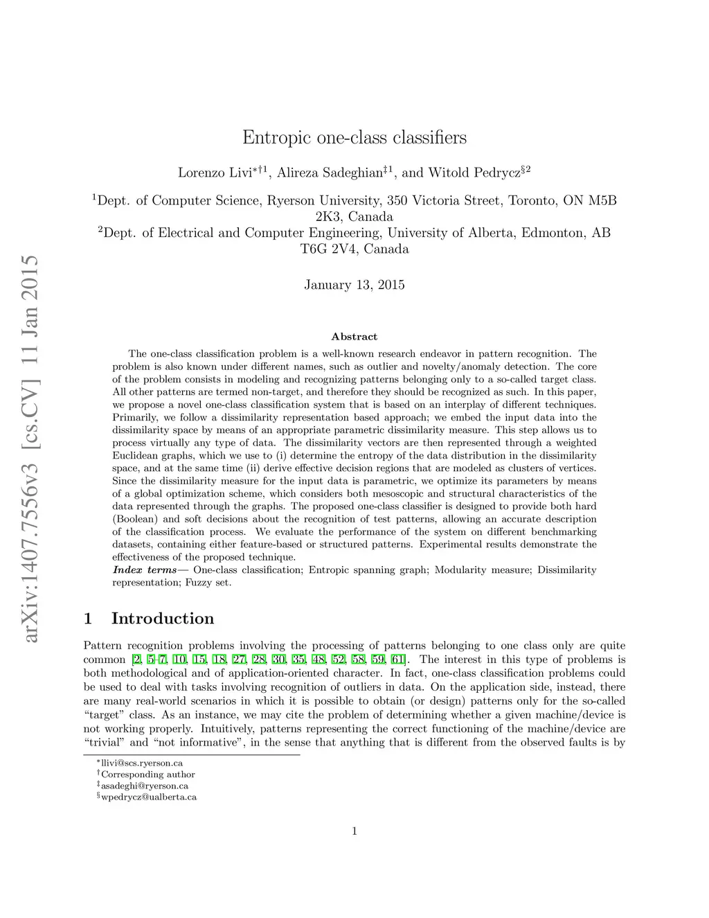 The one-class classification problem is a well-known research endeavor in pattern recognition. The problem is also known under different names, such as outlier and novelty/anomaly detection. The core of the problem consists in modeling and recognizing patterns belonging only to a so-called target class. All other patterns are termed non-target, and therefore they should be recognized as such. In this paper, we propose a novel one-class classification system that is based on an interplay of different techniques. Primarily, we follow a dissimilarity representation based approach; we embed the input data into the dissimilarity space by means of an appropriate parametric dissimilarity measure. This step allows us to process virtually any type of data. The dissimilarity vectors are then represented through a weighted Euclidean graphs, which we use to (i) determine the entropy of the data distribution in the dissimilarity space, and at the same time (ii) derive effective decision regions that are modeled as clusters of vertices. Since the dissimilarity measure for the input data is parametric, we optimize its parameters by means of a global optimization scheme, which considers both mesoscopic and structural characteristics of the data represented through the graphs. The proposed one-class classifier is designed to provide both hard (Boolean) and soft decisions about the recognition of test patterns, allowing an accurate description of the classification process. We evaluate the performance of the system on different benchmarking datasets, containing either feature-based or structured patterns. Experimental results demonstrate the effectiveness of the proposed technique.