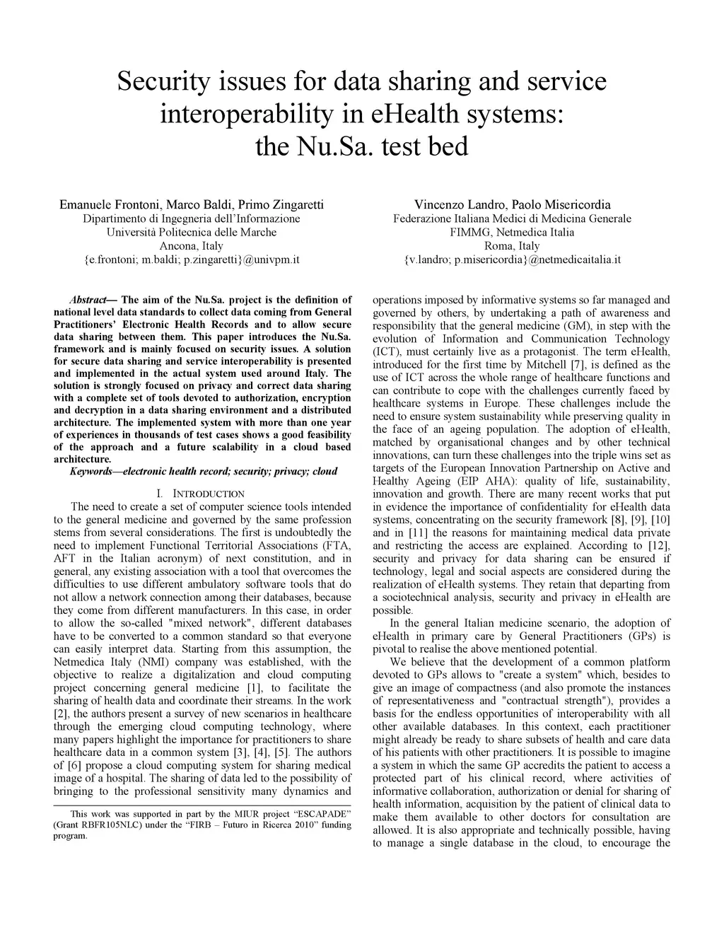 The aim of the Nu.Sa. project is the definition of national level data standards to collect data coming from General Practitioners' Electronic Health Records and to allow secure data sharing between them. This paper introduces the Nu.Sa. framework and is mainly focused on security issues. A solution for secure data sharing and service interoperability is presented and implemented in the actual system used around Italy. The solution is strongly focused on privacy and correct data sharing with a complete set of tools devoted to authorization, encryption and decryption in a data sharing environment and a distributed architecture. The implemented system with more than one year of experiences in thousands of test cases shows a good feasibility of the approach and a future scalability in a cloud based architecture.