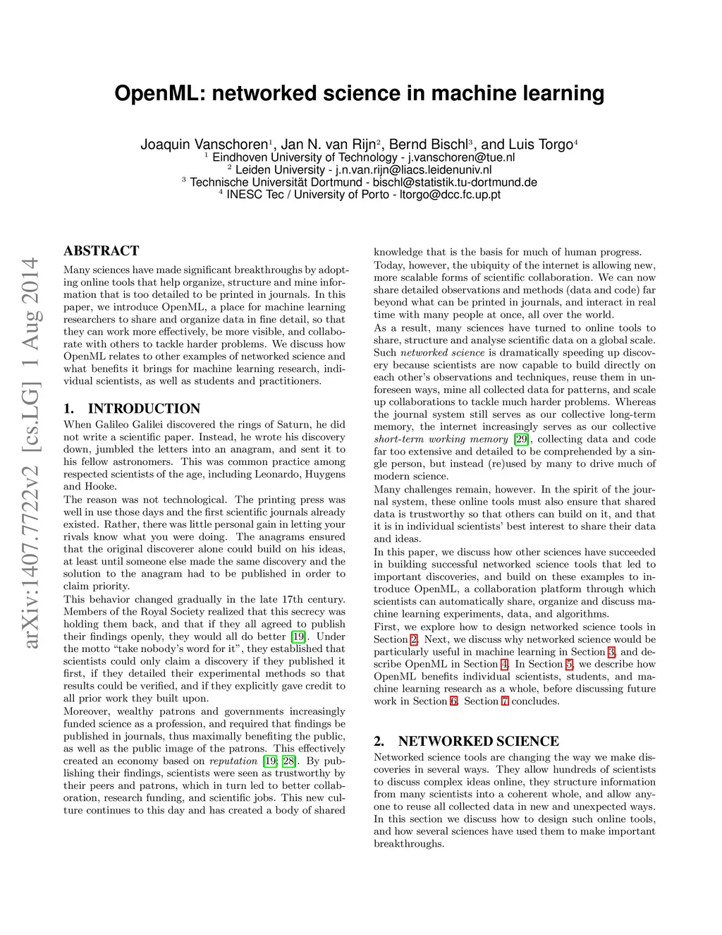 Many sciences have made significant breakthroughs by adopting online tools that help organize, structure and mine information that is too detailed to be printed in journals. In this paper, we introduce OpenML, a place for machine learning researchers to share and organize data in fine detail, so that they can work more effectively, be more visible, and collaborate with others to tackle harder problems. We discuss how OpenML relates to other examples of networked science and what benefits it brings for machine learning research, individual scientists, as well as students and practitioners.