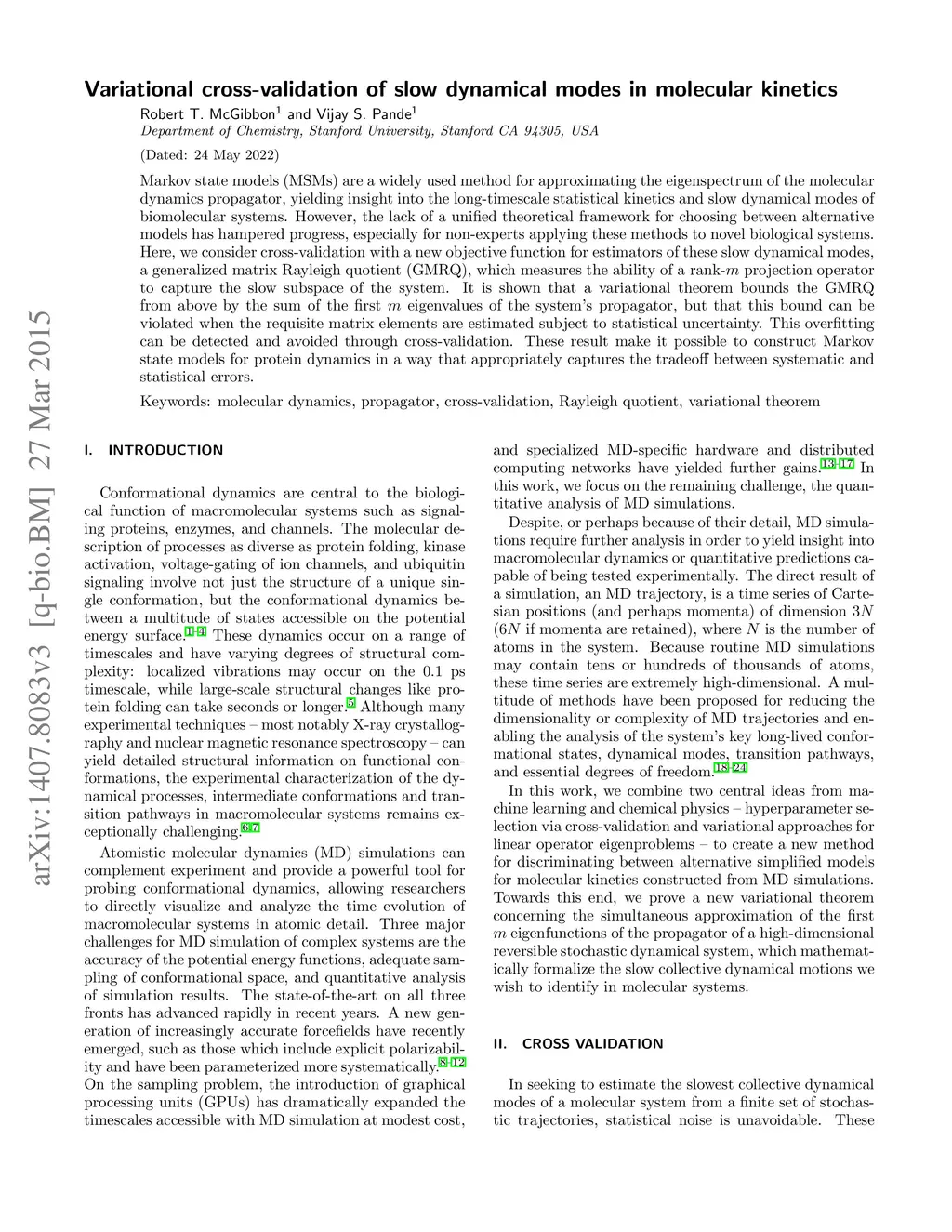 Markov state models (MSMs) are a widely used method for approximating the eigenspectrum of the molecular dynamics propagator, yielding insight into the long-timescale statistical kinetics and slow dynamical modes of biomolecular systems. However, the lack of a unified theoretical framework for choosing between alternative models has hampered progress, especially for non-experts applying these methods to novel biological systems. Here, we consider cross-validation with a new objective function for estimators of these slow dynamical modes, a generalized matrix Rayleigh quotient (GMRQ), which measures the ability of a rank- projection operator to capture the slow subspace of the system. It is shown that a variational theorem bounds the GMRQ from above by the sum of the first eigenvalues of the system's propagator, but that this bound can be violated when the requisite matrix elements are estimated subject to statistical uncertainty. This overfitting can be detected and avoided through cross-validation. These result make it possible to construct Markov state models for protein dynamics in a way that appropriately captures the tradeoff between systematic and statistical errors.