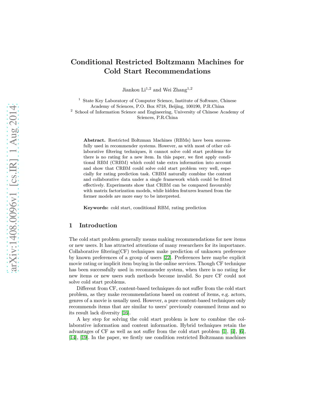 Restricted Boltzman Machines (RBMs) have been successfully used in recommender systems. However, as with most of other collaborative filtering techniques, it cannot solve cold start problems for there is no rating for a new item. In this paper, we first apply conditional RBM (CRBM) which could take extra information into account and show that CRBM could solve cold start problem very well, especially for rating prediction task. CRBM naturally combine the content and collaborative data under a single framework which could be fitted effectively. Experiments show that CRBM can be compared favourably with matrix factorization models, while hidden features learned from the former models are more easy to be interpreted.