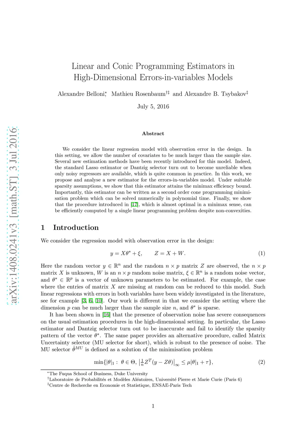 We consider the linear regression model with observation error in the design. In this setting, we allow the number of covariates to be much larger than the sample size. Several new estimation methods have been recently introduced for this model. Indeed, the standard Lasso estimator or Dantzig selector turn out to become unreliable when only noisy regressors are available, which is quite common in practice. We show in this work that under suitable sparsity assumptions, the procedure introduced in Rosenbaum and Tsybakov (2013) is almost optimal in a minimax sense and, despite non-convexities, can be efficiently computed by a single linear programming problem. Furthermore, we provide an estimator attaining the minimax efficiency bound. This estimator is written as a second order cone programming minimisation problem which can be solved numerically in polynomial time.