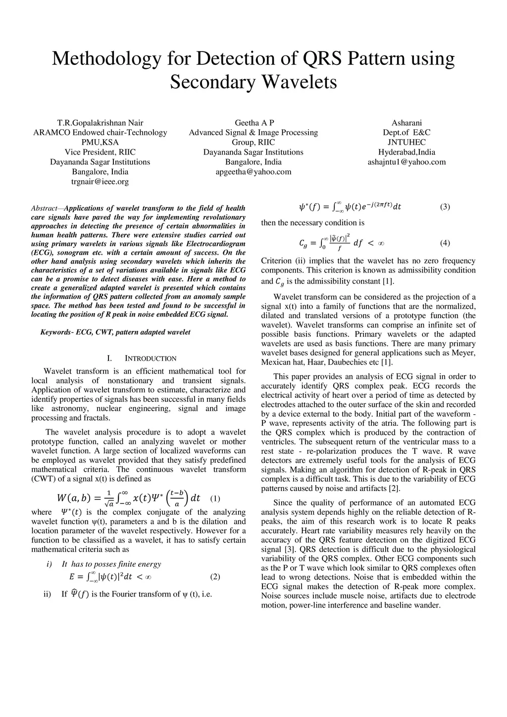 Methodology For Detection of QRS Pattern Using Secondary Wavelets