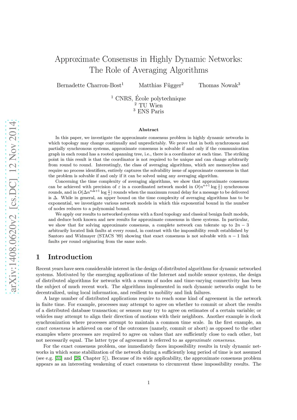 In this paper, we investigate the approximate consensus problem in highly dynamic networks in which topology may change continually and unpredictably. We prove that in both synchronous and partially synchronous systems, approximate consensus is solvable if and only if the communication graph in each round has a rooted spanning tree, i.e., there is a coordinator at each time. The striking point in this result is that the coordinator is not required to be unique and can change arbitrarily from round to round. Interestingly, the class of averaging algorithms, which are memoryless and require no process identifiers, entirely captures the solvability issue of approximate consensus in that the problem is solvable if and only if it can be solved using any averaging algorithm. Concerning the time complexity of averaging algorithms, we show that approximate consensus can be achieved with precision of in a coordinated network model in synchronous rounds, and in rounds when the maximum round delay for a message to be delivered is . While in general, an upper bound on the time complexity of averaging algorithms has to be exponential, we investigate various network models in which this exponential bound in the number of nodes reduces to a polynomial bound. We apply our results to networked systems with a fixed topology and classical benign fault models, and deduce both known and new results for approximate consensus in these systems. In particular, we show that for solving approximate consensus, a complete network can tolerate up to 2n-3 arbitrarily located link faults at every round, in contrast with the impossibility result established by Santoro and Widmayer (STACS '89) showing that exact consensus is not solvable with n-1 link faults per round originating from the same node.