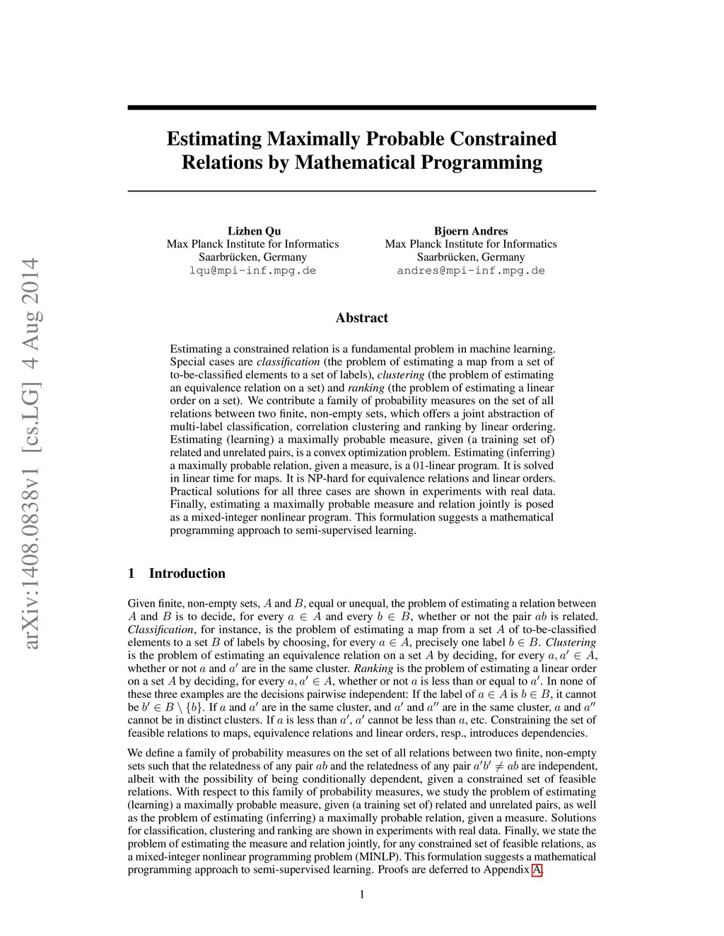 Estimating a constrained relation is a fundamental problem in machine learning. Special cases are classification (the problem of estimating a map from a set of to-be-classified elements to a set of labels), clustering (the problem of estimating an equivalence relation on a set) and ranking (the problem of estimating a linear order on a set). We contribute a family of probability measures on the set of all relations between two finite, non-empty sets, which offers a joint abstraction of multi-label classification, correlation clustering and ranking by linear ordering. Estimating (learning) a maximally probable measure, given (a training set of) related and unrelated pairs, is a convex optimization problem. Estimating (inferring) a maximally probable relation, given a measure, is a 01-linear program. It is solved in linear time for maps. It is NP-hard for equivalence relations and linear orders. Practical solutions for all three cases are shown in experiments with real data. Finally, estimating a maximally probable measure and relation jointly is posed as a mixed-integer nonlinear program. This formulation suggests a mathematical programming approach to semi-supervised learning.
