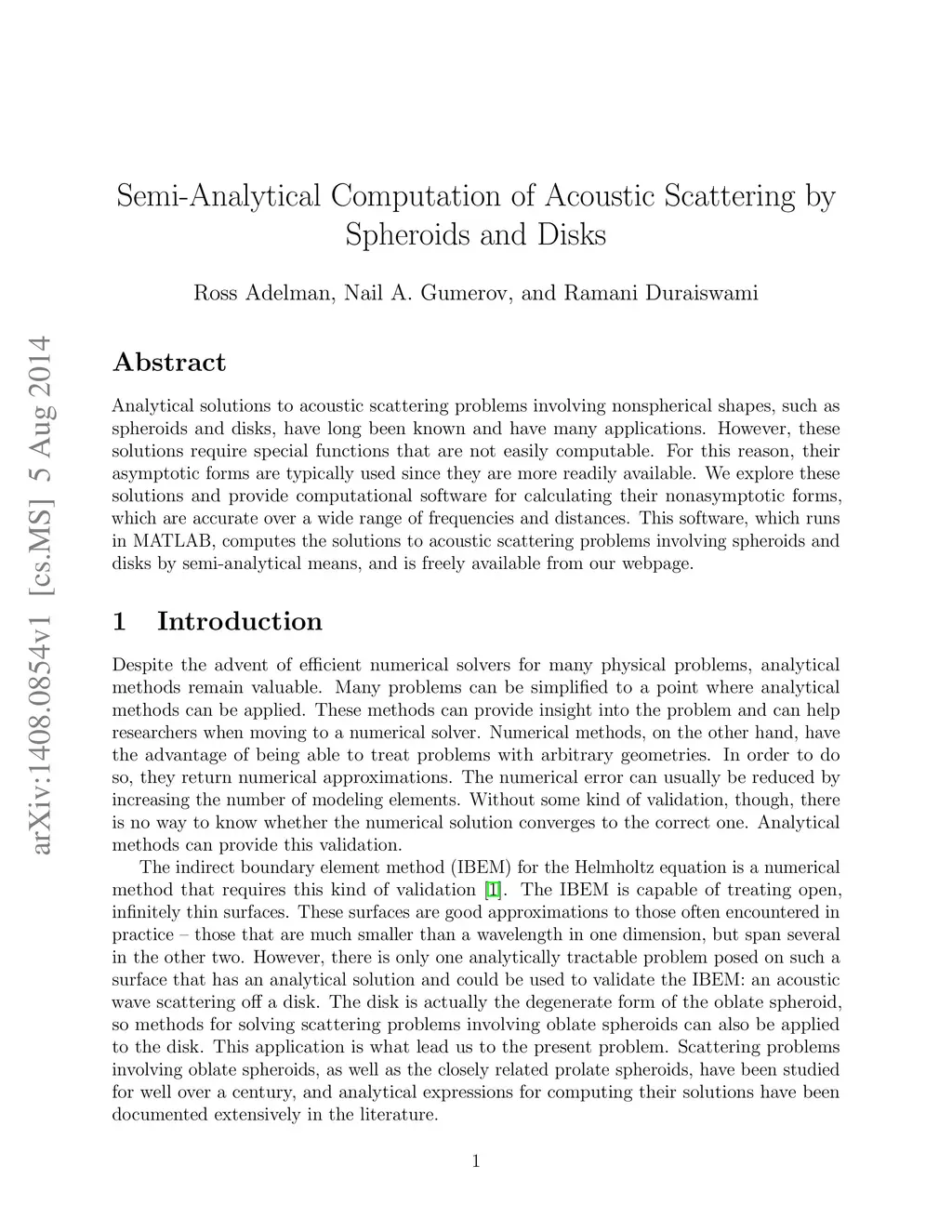 Analytical solutions to acoustic scattering problems involving nonspherical shapes, such as spheroids and disks, have long been known and have many applications. However, these solutions require special functions that are not easily computable. For this reason, their asymptotic forms are typically used since they are more readily available. We explore these solutions and provide computational software for calculating their nonasymptotic forms, which are accurate over a wide range of frequencies and distances. This software, which runs in MATLAB, computes the solutions to acoustic scattering problems involving spheroids and disks by semi-analytical means, and is freely available from our webpage.