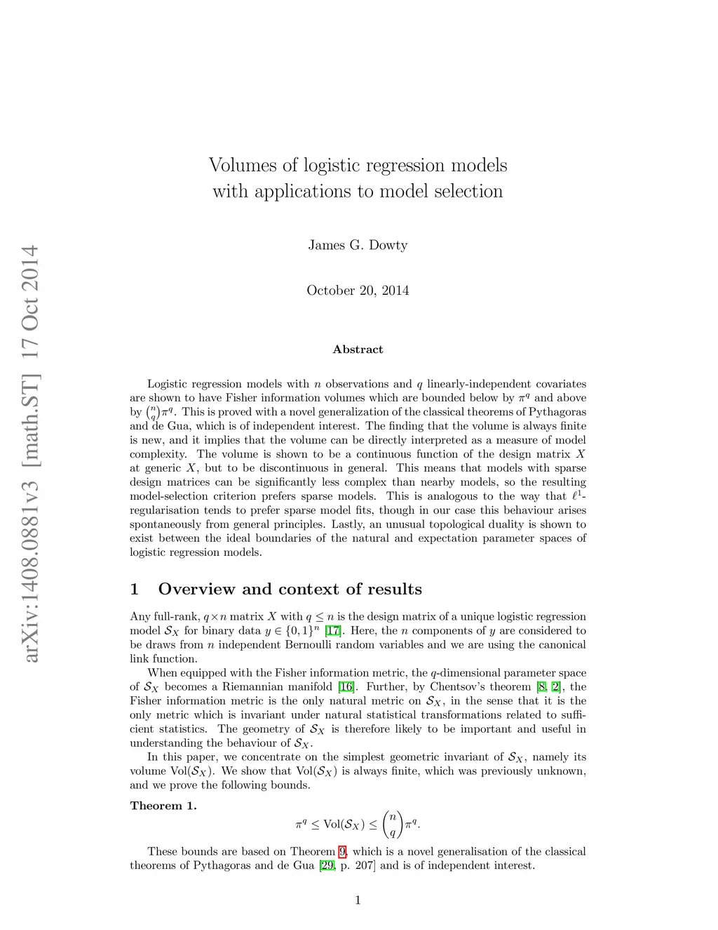 Logistic regression models with observations and linearly-independent covariates are shown to have Fisher information volumes which are bounded below by and above by . This is proved with a novel generalization of the classical theorems of Pythagoras and de Gua, which is of independent interest. The finding that the volume is always finite is new, and it implies that the volume can be directly interpreted as a measure of model complexity. The volume is shown to be a continuous function of the design matrix at generic , but to be discontinuous in general. This means that models with sparse design matrices can be significantly less complex than nearby models, so the resulting model-selection criterion prefers sparse models. This is analogous to the way that -regularisation tends to prefer sparse model fits, though in our case this behaviour arises spontaneously from general principles. Lastly, an unusual topological duality is shown to exist between the ideal boundaries of the natural and expectation parameter spaces of logistic regression models.