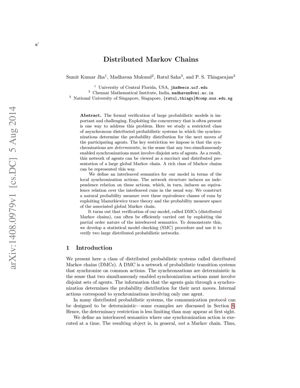 The formal verification of large probabilistic models is important and challenging. Exploiting the concurrency that is often present is one way to address this problem. Here we study a restricted class of asynchronous distributed probabilistic systems in which the synchronizations determine the probability distribution for the next moves of the participating agents. The key restriction we impose is that the synchronizations are deterministic, in the sense that any two simultaneously enabled synchronizations must involve disjoint sets of agents. As a result, this network of agents can be viewed as a succinct and distributed presentation of a large global Markov chain. A rich class of Markov chains can be represented this way. We define an interleaved semantics for our model in terms of the local synchronization actions. The network structure induces an independence relation on these actions, which, in turn, induces an equivalence relation over the interleaved runs in the usual way. We construct a natural probability measure over these equivalence classes of runs by exploiting Mazurkiewicz trace theory and the probability measure space of the associated global Markov chain. It turns out that verification of our model, called DMCs (distributed Markov chains), can often be efficiently carried out by exploiting the partial order nature of the interleaved semantics. To demonstrate this, we develop a statistical model checking (SMC) procedure and use it to verify two large distributed probabilistic networks.