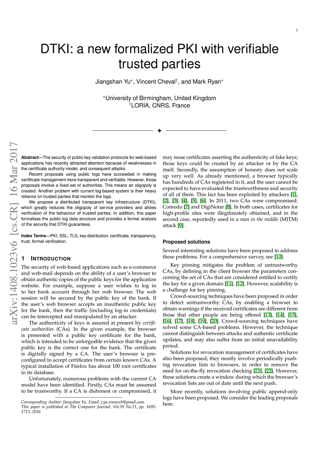 The security of public key validation protocols for web-based applications has recently attracted attention because of weaknesses in the certificate authority model, and consequent attacks. Recent proposals using public logs have succeeded in making certificate management more transparent and verifiable. However, those proposals involve a fixed set of authorities. This means an oligopoly is created. Another problem with current log-based system is their heavy reliance on trusted parties that monitor the logs. We propose a distributed transparent key infrastructure (DTKI), which greatly reduces the oligopoly of service providers and allows verification of the behaviour of trusted parties. In addition, this paper formalises the public log data structure and provides a formal analysis of the security that DTKI guarantees.