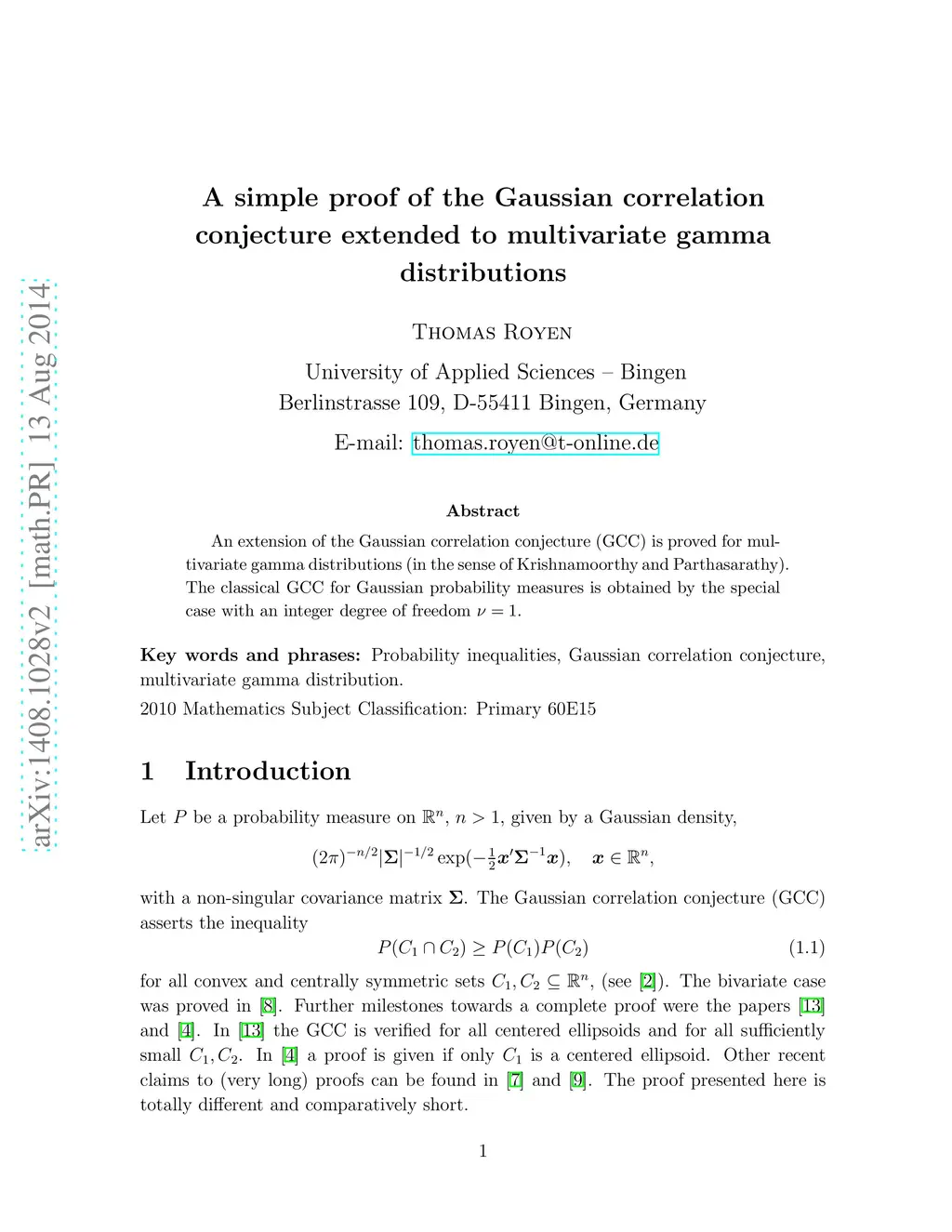 An extension of the Gaussian correlation conjecture (GCC) is proved for multivariate gamma distributions (in the sense of Krishnamoorthy and Parthasarathy). The classical GCC for Gaussian probability measures is obtained by the special case with one degree of freedom.