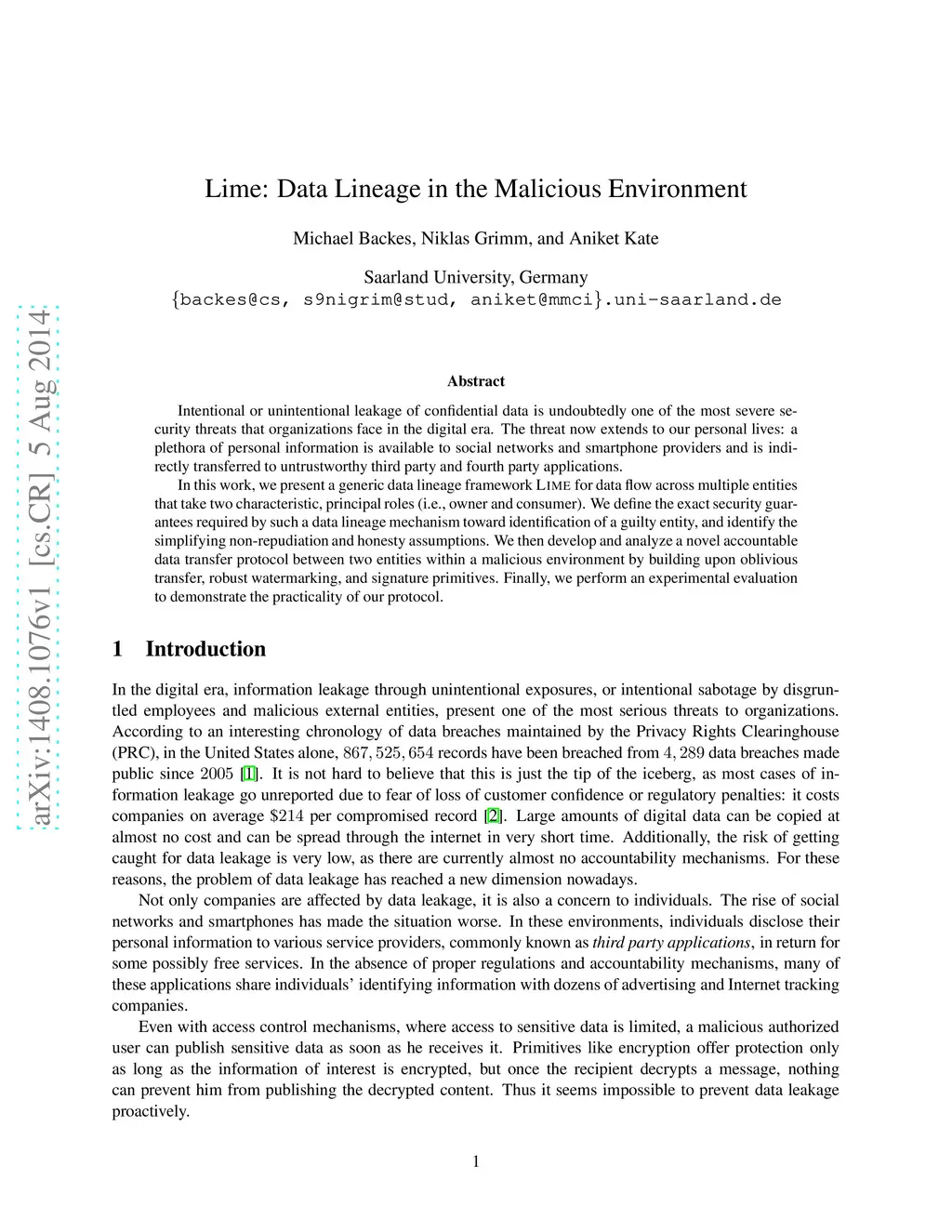 Intentional or unintentional leakage of confidential data is undoubtedly one of the most severe security threats that organizations face in the digital era. The threat now extends to our personal lives: a plethora of personal information is available to social networks and smartphone providers and is indirectly transferred to untrustworthy third party and fourth party applications. In this work, we present a generic data lineage framework LIME for data flow across multiple entities that take two characteristic, principal roles (i.e., owner and consumer). We define the exact security guarantees required by such a data lineage mechanism toward identification of a guilty entity, and identify the simplifying non repudiation and honesty assumptions. We then develop and analyze a novel accountable data transfer protocol between two entities within a malicious environment by building upon oblivious transfer, robust watermarking, and signature primitives. Finally, we perform an experimental evaluation to demonstrate the practicality of our protocol.