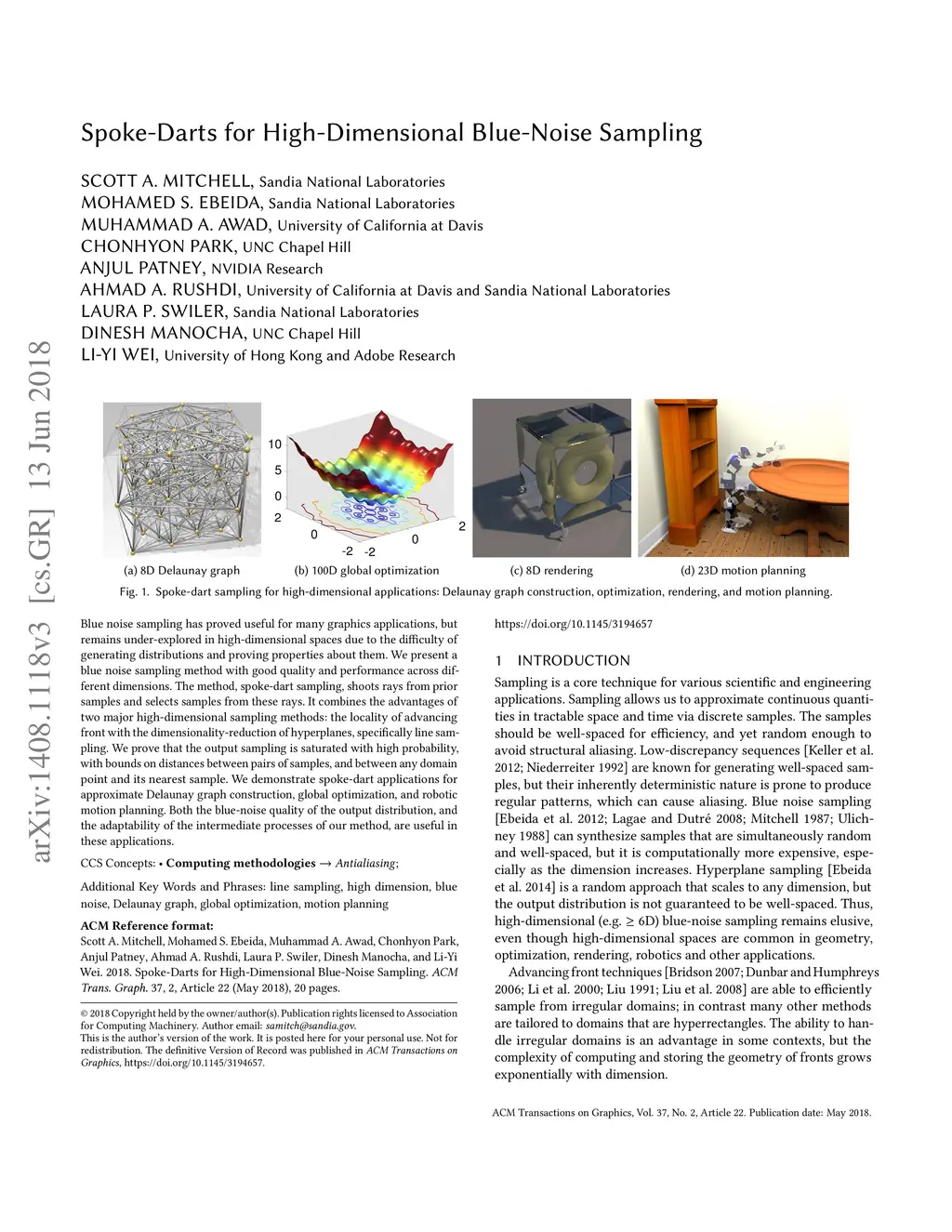 Blue noise sampling has proved useful for many graphics applications, but remains underexplored in high-dimensional spaces due to the difficulty of generating distributions and proving properties about them. We present a blue noise sampling method with good quality and performance across different dimensions. The method, spoke-dart sampling, shoots rays from prior samples and selects samples from these rays. It combines the advantages of two major high-dimensional sampling methods: the locality of advancing front with the dimensionality-reduction of hyperplanes, specifically line sampling. We prove that the output sampling is saturated with high probability, with bounds on distances between pairs of samples and between any domain point and its nearest sample. We demonstrate spoke-dart applications for approximate Delaunay graph construction, global optimization, and robotic motion planning. Both the blue-noise quality of the output distribution and the adaptability of the intermediate processes of our method are useful in these applications.