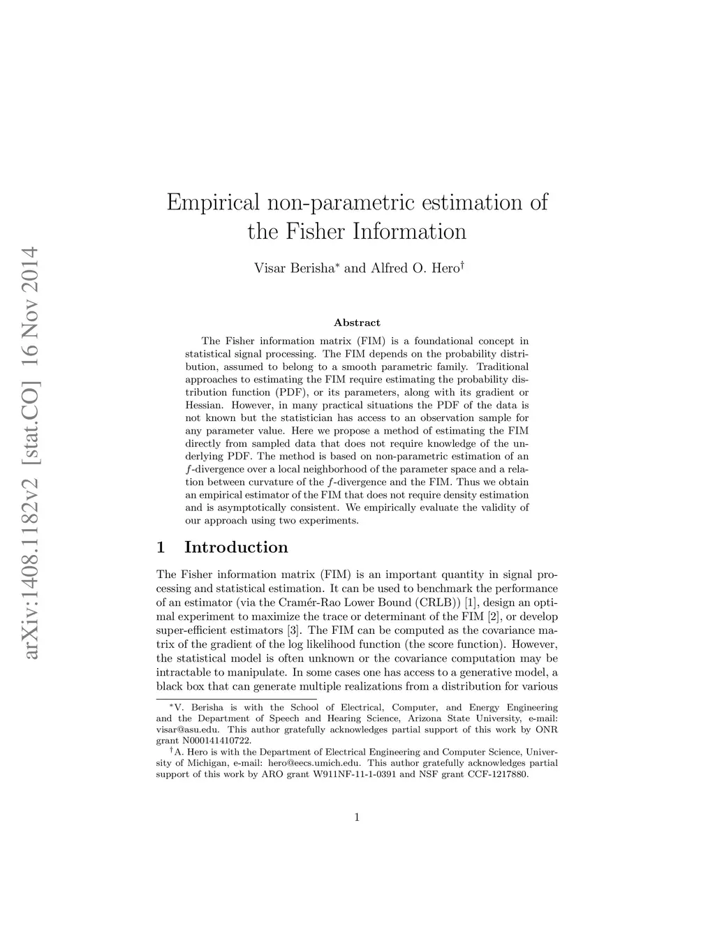 The Fisher information matrix (FIM) is a foundational concept in statistical signal processing. The FIM depends on the probability distribution, assumed to belong to a smooth parametric family. Traditional approaches to estimating the FIM require estimating the probability distribution function (PDF), or its parameters, along with its gradient or Hessian. However, in many practical situations the PDF of the data is not known but the statistician has access to an observation sample for any parameter value. Here we propose a method of estimating the FIM directly from sampled data that does not require knowledge of the underlying PDF. The method is based on non-parametric estimation of an -divergence over a local neighborhood of the parameter space and a relation between curvature of the -divergence and the FIM. Thus we obtain an empirical estimator of the FIM that does not require density estimation and is asymptotically consistent. We empirically evaluate the validity of our approach using two experiments.