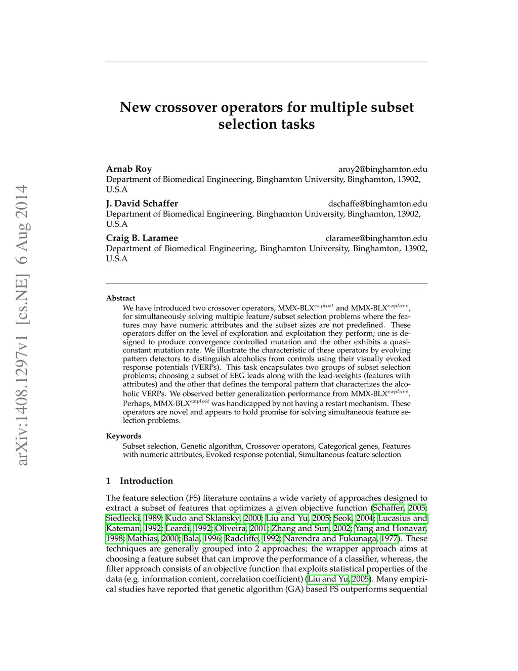 We have introduced two crossover operators, MMX-BLXexploit and MMX-BLXexplore, for simultaneously solving multiple feature/subset selection problems where the features may have numeric attributes and the subset sizes are not predefined. These operators differ on the level of exploration and exploitation they perform; one is designed to produce convergence controlled mutation and the other exhibits a quasi-constant mutation rate. We illustrate the characteristic of these operators by evolving pattern detectors to distinguish alcoholics from controls using their visually evoked response potentials (VERPs). This task encapsulates two groups of subset selection problems; choosing a subset of EEG leads along with the lead-weights (features with attributes) and the other that defines the temporal pattern that characterizes the alcoholic VERPs. We observed better generalization performance from MMX-BLXexplore. Perhaps, MMX-BLXexploit was handicapped by not having a restart mechanism. These operators are novel and appears to hold promise for solving simultaneous feature selection problems.