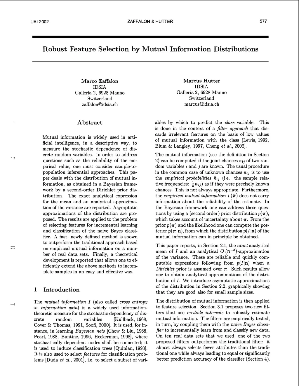 Mutual information is widely used in artificial intelligence, in a descriptive way, to measure the stochastic dependence of discrete random variables. In order to address questions such as the reliability of the empirical value, one must consider sample-to-population inferential approaches. This paper deals with the distribution of mutual information, as obtained in a Bayesian framework by a second-order Dirichlet prior distribution. The exact analytical expression for the mean and an analytical approximation of the variance are reported. Asymptotic approximations of the distribution are proposed. The results are applied to the problem of selecting features for incremental learning and classification of the naive Bayes classifier. A fast, newly defined method is shown to outperform the traditional approach based on empirical mutual information on a number of real data sets. Finally, a theoretical development is reported that allows one to efficiently extend the above methods to incomplete samples in an easy and effective way.