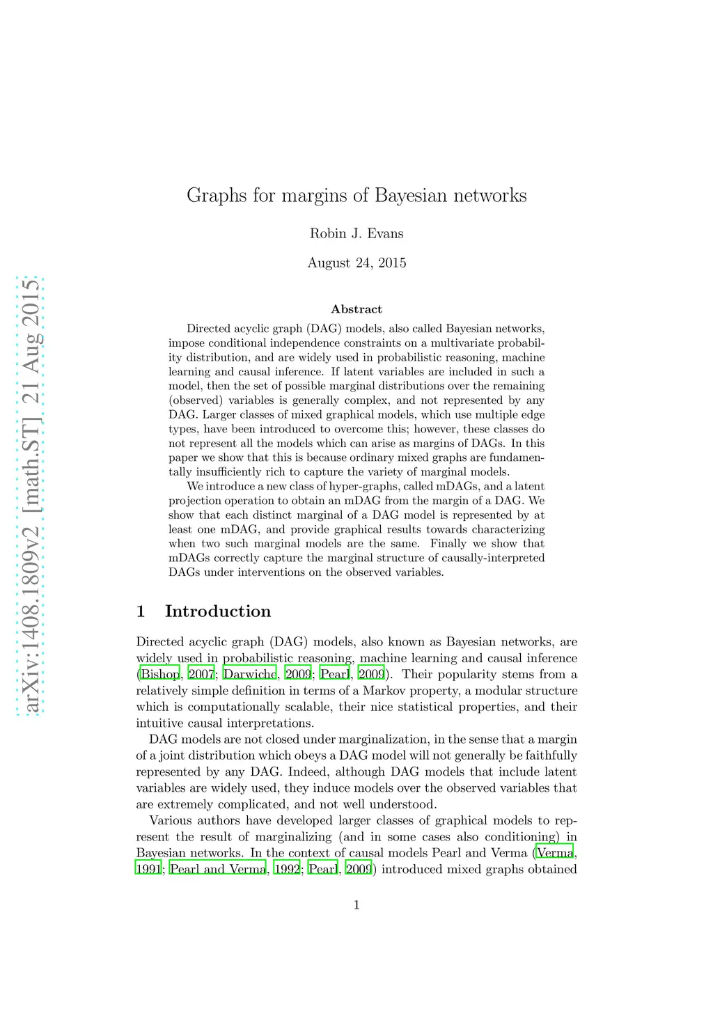 Directed acyclic graph (DAG) models, also called Bayesian networks, impose conditional independence constraints on a multivariate probability distribution, and are widely used in probabilistic reasoning, machine learning and causal inference. If latent variables are included in such a model, then the set of possible marginal distributions over the remaining (observed) variables is generally complex, and not represented by any DAG. Larger classes of mixed graphical models, which use multiple edge types, have been introduced to overcome this; however, these classes do not represent all the models which can arise as margins of DAGs. In this paper we show that this is because ordinary mixed graphs are fundamentally insufficiently rich to capture the variety of marginal models. We introduce a new class of hyper-graphs, called mDAGs, and a latent projection operation to obtain an mDAG from the margin of a DAG. We show that each distinct marginal of a DAG model is represented by at least one mDAG, and provide graphical results towards characterizing when two such marginal models are the same. Finally we show that mDAGs correctly capture the marginal structure of causally-interpreted DAGs under interventions on the observed variables.