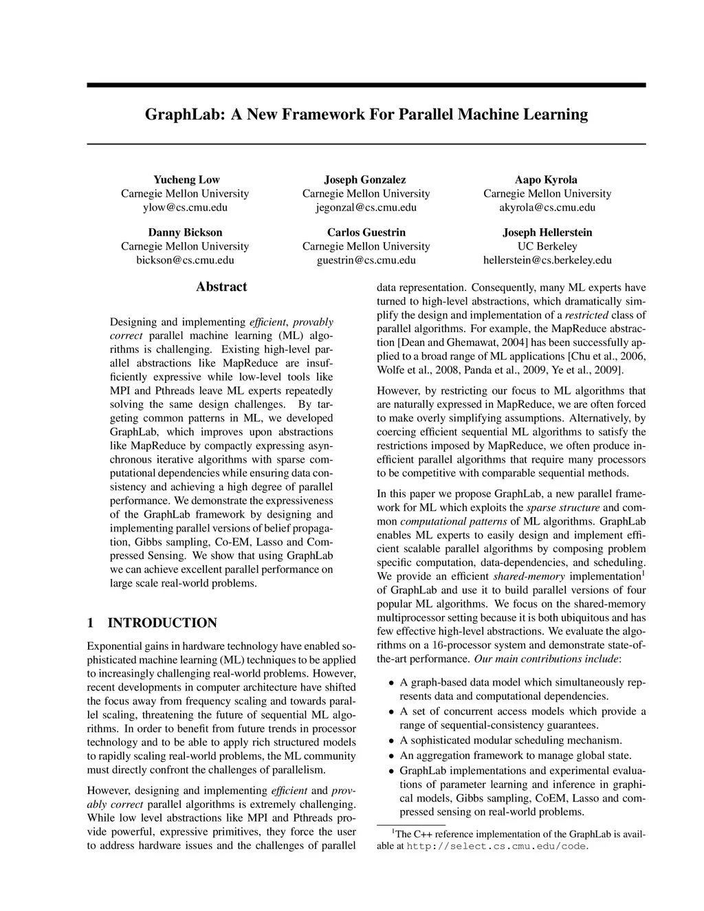 Designing and implementing efficient, provably correct parallel machine learning (ML) algorithms is challenging. Existing high-level parallel abstractions like MapReduce are insufficiently expressive while low-level tools like MPI and Pthreads leave ML experts repeatedly solving the same design challenges. By targeting common patterns in ML, we developed GraphLab, which improves upon abstractions like MapReduce by compactly expressing asynchronous iterative algorithms with sparse computational dependencies while ensuring data consistency and achieving a high degree of parallel performance. We demonstrate the expressiveness of the GraphLab framework by designing and implementing parallel versions of belief propagation, Gibbs sampling, Co-EM, Lasso and Compressed Sensing. We show that using GraphLab we can achieve excellent parallel performance on large scale real-world problems.