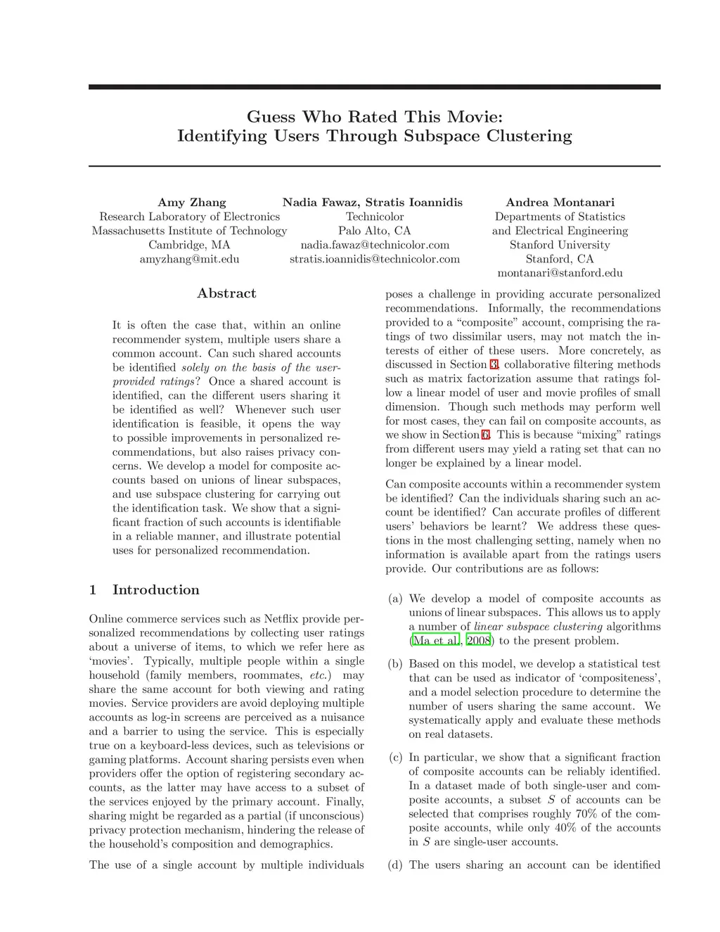 It is often the case that, within an online recommender system, multiple users share a common account. Can such shared accounts be identified solely on the basis of the userprovided ratings? Once a shared account is identified, can the different users sharing it be identified as well? Whenever such user identification is feasible, it opens the way to possible improvements in personalized recommendations, but also raises privacy concerns. We develop a model for composite accounts based on unions of linear subspaces, and use subspace clustering for carrying out the identification task. We show that a significant fraction of such accounts is identifiable in a reliable manner, and illustrate potential uses for personalized recommendation.