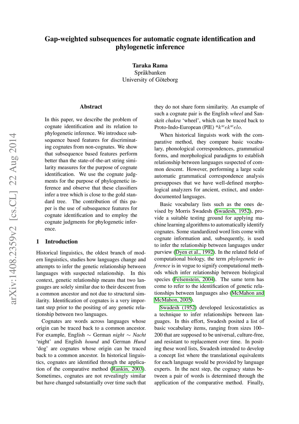 Gap-weighted subsequences for automatic cognate identification and