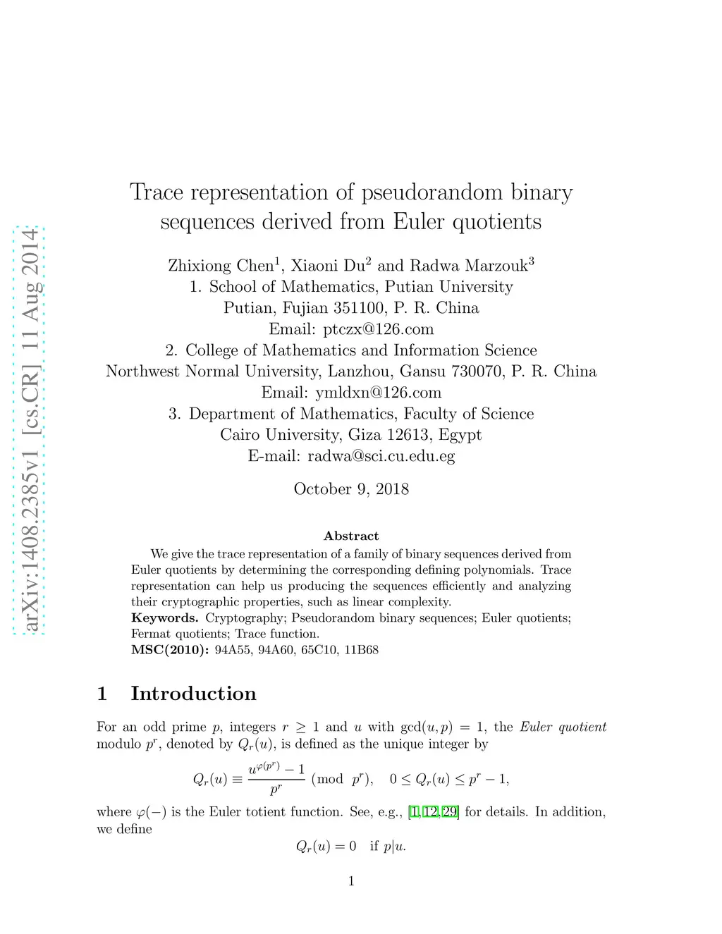 Trace representation of pseudorandom binary sequences derived from Euler
