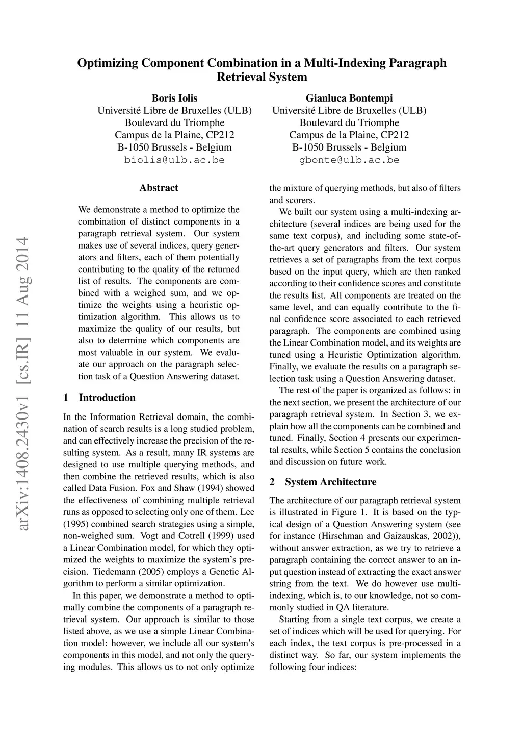 We demonstrate a method to optimize the combination of distinct components in a paragraph retrieval system. Our system makes use of several indices, query generators and filters, each of them potentially contributing to the quality of the returned list of results. The components are combined with a weighed sum, and we optimize the weights using a heuristic optimization algorithm. This allows us to maximize the quality of our results, but also to determine which components are most valuable in our system. We evaluate our approach on the paragraph selection task of a Question Answering dataset.