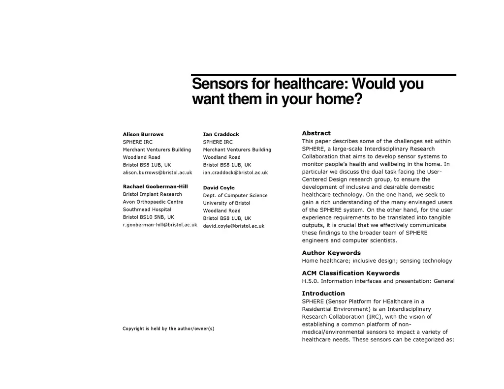This paper describes some of the challenges set within SPHERE, a large-scale Interdisciplinary Research Collaboration that aims to develop sensor systems to monitor people's health and wellbeing in the home. In particular we discuss the dual task facing the User- Centered Design research group, to ensure the development of inclusive and desirable domestic healthcare technology. On the one hand, we seek to gain a rich understanding of the many envisaged users of the SPHERE system. On the other hand, for the user experience requirements to be translated into tangible outputs, it is crucial that we effectively communicate these findings to the broader team of SPHERE engineers and computer scientists.