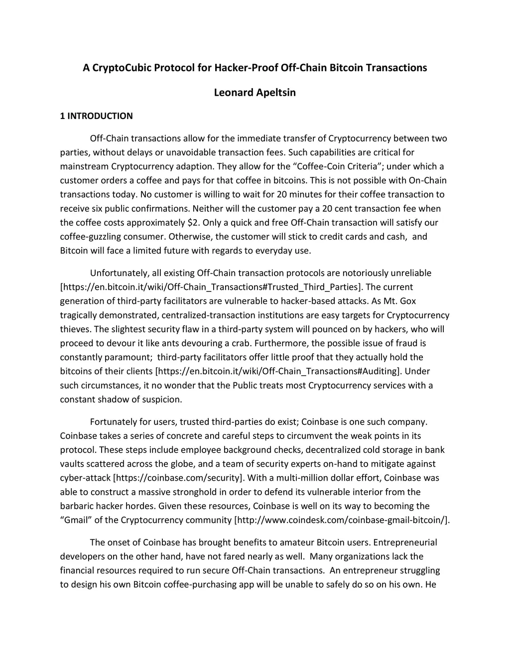 Off-Chain transactions allow for the immediate transfer of Cryptocurrency between two parties, without delays or unavoidable transaction fees. Such capabilities are critical for mainstream Cryptocurrency adaption. They allow for the "Coffee-Coin Criteria"; under which a customer orders a coffee and pays for that coffee in bitcoins. This is not possible with On-Chain transactions today. Unfortunately, all existing Off-Chain transaction protocols are notoriously unreliable The current generation of third-party facilitators are vulnerable to hacker-based attacks. As Mt. Gox tragically demonstrated, centralized-transaction institutions are easy targets for Cryptocurrency thieves. The slightest security flaw in a third-party system will pounced on by hackers, who will proceed to devour it like ants devouring a crab. Under such circumstances, it no wonder that the Public treats most Cryptocurrency services with a constant shadow of suspicion. For Bitcoin to flourish, its anti-hierarchy principles must be applied to safe Off-Chain transactions. First and foremost, we need a new hacker-proof protocol that can easily be executed by any experienced developer. Preferably, the protocol will be open-sourced for full reliability and transparency. This paper presents one such procedure, which allows for he safe transmission of Bitcoin private key control by way of Cryptocubic transactions.