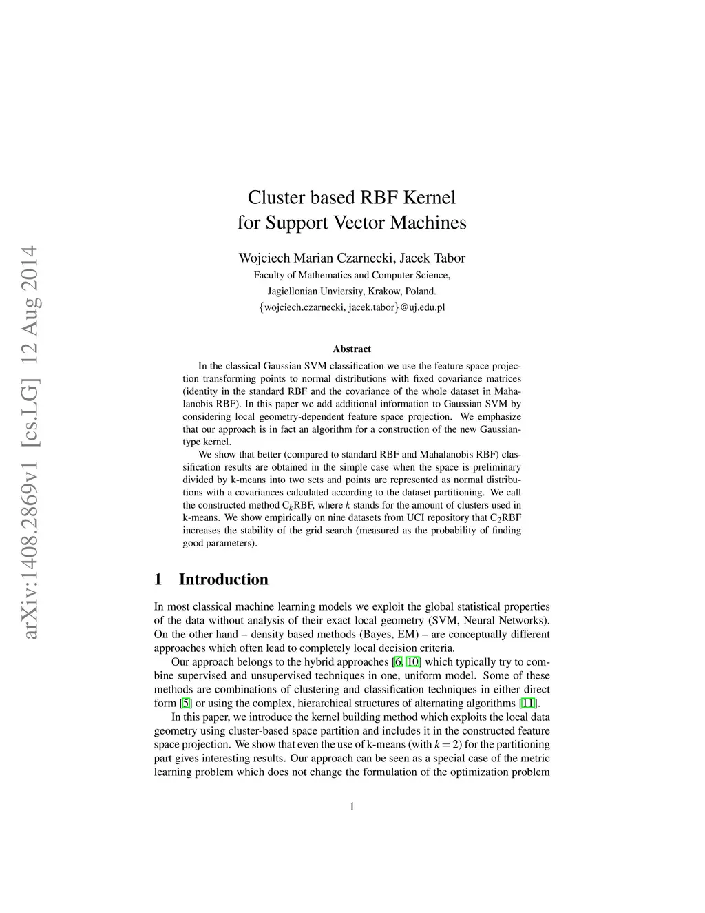 In the classical Gaussian SVM classification we use the feature space projection transforming points to normal distributions with fixed covariance matrices (identity in the standard RBF and the covariance of the whole dataset in Mahalanobis RBF). In this paper we add additional information to Gaussian SVM by considering local geometry-dependent feature space projection. We emphasize that our approach is in fact an algorithm for a construction of the new Gaussian-type kernel. We show that better (compared to standard RBF and Mahalanobis RBF) classification results are obtained in the simple case when the space is preliminary divided by k-means into two sets and points are represented as normal distributions with a covariances calculated according to the dataset partitioning. We call the constructed method CRBF, where stands for the amount of clusters used in k-means. We show empirically on nine datasets from UCI repository that CRBF increases the stability of the grid search (measured as the probability of finding good parameters).