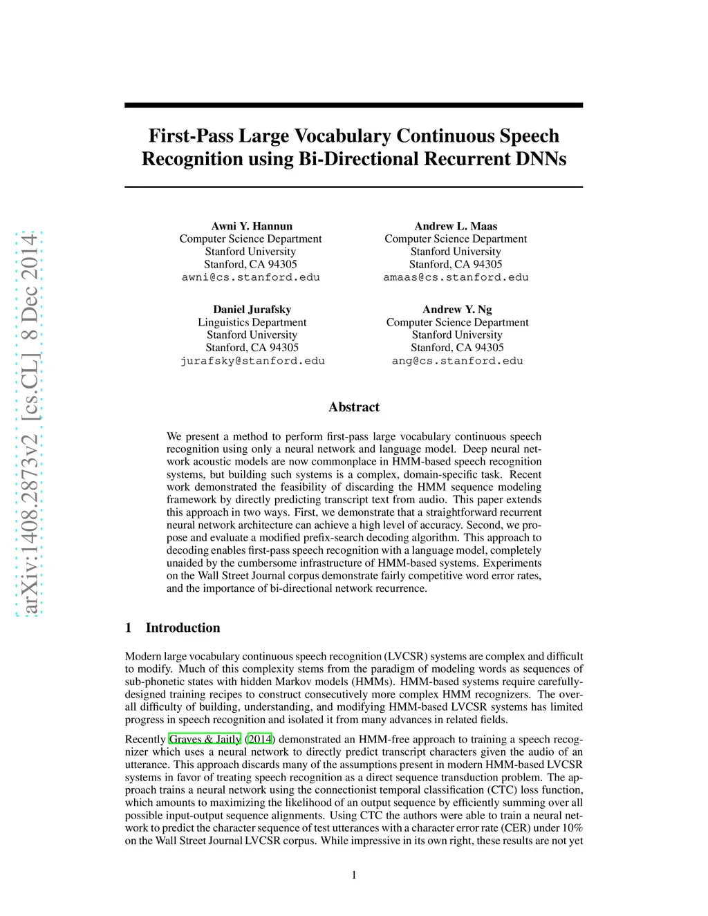 We present a method to perform first-pass large vocabulary continuous speech recognition using only a neural network and language model. Deep neural network acoustic models are now commonplace in HMM-based speech recognition systems, but building such systems is a complex, domain-specific task. Recent work demonstrated the feasibility of discarding the HMM sequence modeling framework by directly predicting transcript text from audio. This paper extends this approach in two ways. First, we demonstrate that a straightforward recurrent neural network architecture can achieve a high level of accuracy. Second, we propose and evaluate a modified prefix-search decoding algorithm. This approach to decoding enables first-pass speech recognition with a language model, completely unaided by the cumbersome infrastructure of HMM-based systems. Experiments on the Wall Street Journal corpus demonstrate fairly competitive word error rates, and the importance of bi-directional network recurrence.