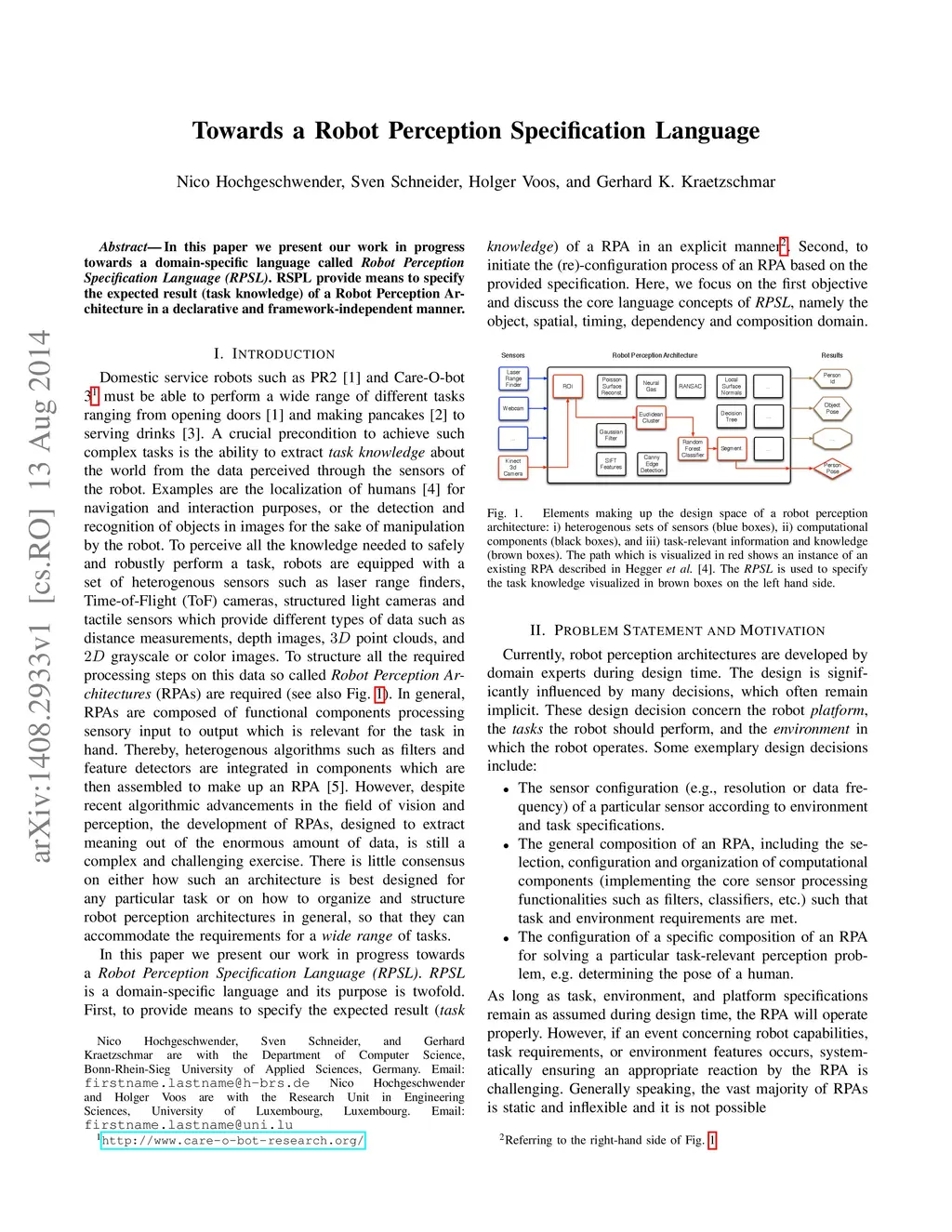 In this paper we present our work in progress towards a domain-specific language called Robot Perception Specification Language (RPSL). RSPL provide means to specify the expected result (task knowledge) of a Robot Perception Architecture in a declarative and framework-independent manner.