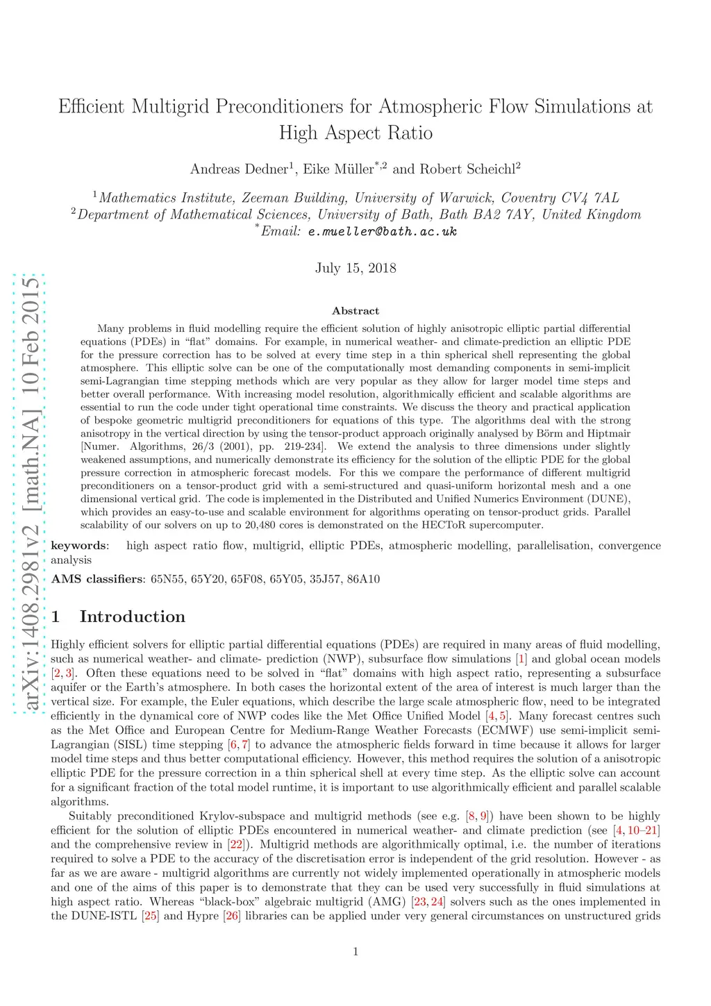 Many problems in fluid modelling require the efficient solution of highly anisotropic elliptic partial differential equations (PDEs) in "flat" domains. For example, in numerical weather- and climate-prediction an elliptic PDE for the pressure correction has to be solved at every time step in a thin spherical shell representing the global atmosphere. This elliptic solve can be one of the computationally most demanding components in semi-implicit semi-Lagrangian time stepping methods which are very popular as they allow for larger model time steps and better overall performance. With increasing model resolution, algorithmically efficient and scalable algorithms are essential to run the code under tight operational time constraints. We discuss the theory and practical application of bespoke geometric multigrid preconditioners for equations of this type. The algorithms deal with the strong anisotropy in the vertical direction by using the tensor-product approach originally analysed by B\"{o}rm and Hiptmair [Numer. Algorithms, 26/3 (2001), pp. 219-234]. We extend the analysis to three dimensions under slightly weakened assumptions, and numerically demonstrate its efficiency for the solution of the elliptic PDE for the global pressure correction in atmospheric forecast models. For this we compare the performance of different multigrid preconditioners on a tensor-product grid with a semi-structured and quasi-uniform horizontal mesh and a one dimensional vertical grid. The code is implemented in the Distributed and Unified Numerics Environment (DUNE), which provides an easy-to-use and scalable environment for algorithms operating on tensor-product grids. Parallel scalability of our solvers on up to 20,480 cores is demonstrated on the HECToR supercomputer.