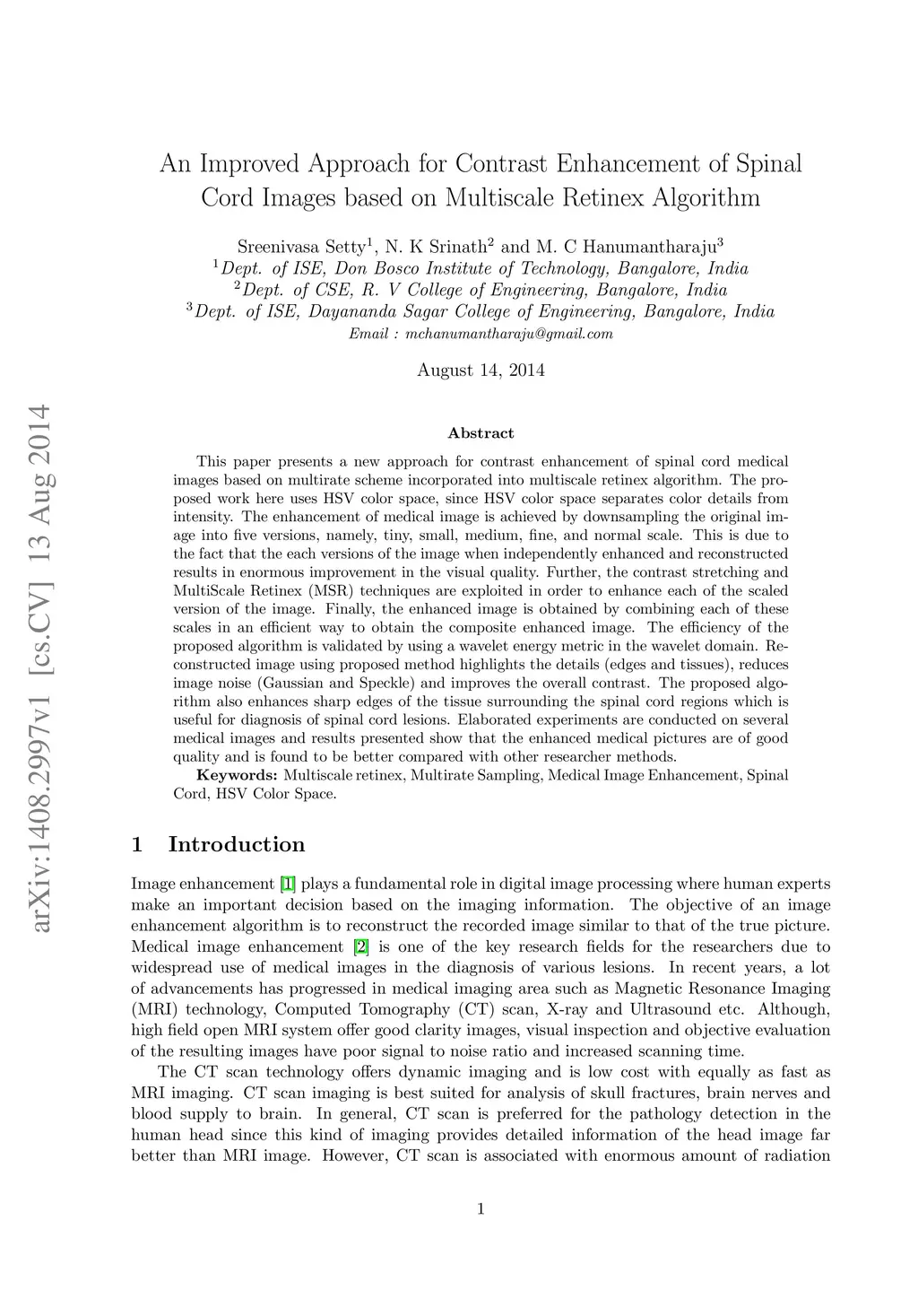 This paper presents a new approach for contrast enhancement of spinal cord medical images based on multirate scheme incorporated into multiscale retinex algorithm. The proposed work here uses HSV color space, since HSV color space separates color details from intensity. The enhancement of medical image is achieved by down sampling the original image into five versions, namely, tiny, small, medium, fine, and normal scale. This is due to the fact that the each versions of the image when independently enhanced and reconstructed results in enormous improvement in the visual quality. Further, the contrast stretching and MultiScale Retinex (MSR) techniques are exploited in order to enhance each of the scaled version of the image. Finally, the enhanced image is obtained by combining each of these scales in an efficient way to obtain the composite enhanced image. The efficiency of the proposed algorithm is validated by using a wavelet energy metric in the wavelet domain. Reconstructed image using proposed method highlights the details (edges and tissues), reduces image noise (Gaussian and Speckle) and improves the overall contrast. The proposed algorithm also enhances sharp edges of the tissue surrounding the spinal cord regions which is useful for diagnosis of spinal cord lesions. Elaborated experiments are conducted on several medical images and results presented show that the enhanced medical pictures are of good quality and is found to be better compared with other researcher methods.