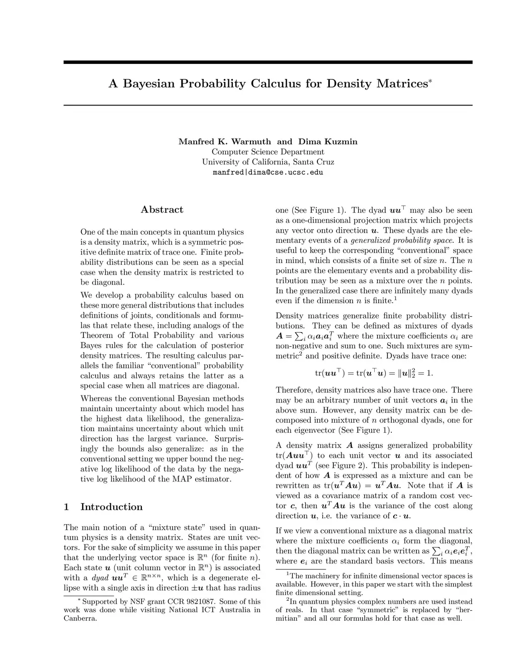 One of the main concepts in quantum physics is a density matrix, which is a symmetric positive definite matrix of trace one. Finite probability distributions are a special case where the density matrix is restricted to be diagonal. Density matrices are mixtures of dyads, where a dyad has the form uu' for any any unit column vector u. These unit vectors are the elementary events of the generalized probability space. Perhaps the simplest case to see that something unusual is going on is the case of uniform density matrix, i.e. 1/n times identity. This matrix assigns probability 1/n to every unit vector, but of course there are infinitely many of them. The new normalization rule thus says that sum of probabilities over any orthonormal basis of directions is one. We develop a probability calculus based on these more general distributions that includes definitions of joints, conditionals and formulas that relate these, i.e. analogs of the theorem of total probability, various Bayes rules for the calculation of posterior density matrices, etc. The resulting calculus parallels the familiar 'classical' probability calculus and always retains the latter as a special case when all matrices are diagonal. Whereas the classical Bayesian methods maintain uncertainty about which model is 'best', the generalization maintains uncertainty about which unit direction has the largest variance. Surprisingly the bounds also generalize: as in the classical setting we bound the negative log likelihood of the data by the negative log likelihood of the MAP estimator.