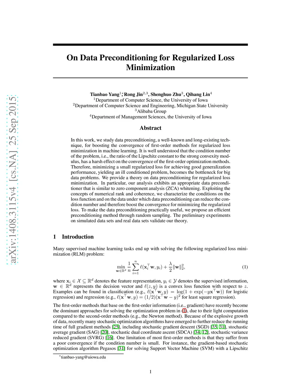 In this work, we study data preconditioning, a well-known and long-existing technique, for boosting the convergence of first-order methods for regularized loss minimization. It is well understood that the condition number of the problem, i.e., the ratio of the Lipschitz constant to the strong convexity modulus, has a harsh effect on the convergence of the first-order optimization methods. Therefore, minimizing a small regularized loss for achieving good generalization performance, yielding an ill conditioned problem, becomes the bottleneck for big data problems. We provide a theory on data preconditioning for regularized loss minimization. In particular, our analysis exhibits an appropriate data preconditioner and characterizes the conditions on the loss function and on the data under which data preconditioning can reduce the condition number and therefore boost the convergence for minimizing the regularized loss. To make the data preconditioning practically useful, we endeavor to employ and analyze a random sampling approach to efficiently compute the preconditioned data. The preliminary experiments validate our theory.