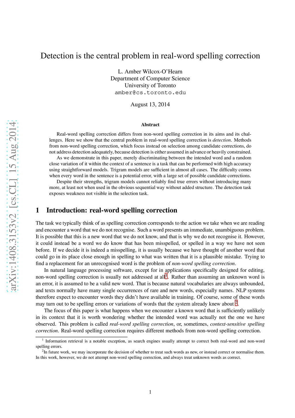 Real-word spelling correction differs from non-word spelling correction in its aims and its challenges. Here we show that the central problem in real-word spelling correction is detection. Methods from non-word spelling correction, which focus instead on selection among candidate corrections, do not address detection adequately, because detection is either assumed in advance or heavily constrained. As we demonstrate in this paper, merely discriminating between the intended word and a random close variation of it within the context of a sentence is a task that can be performed with high accuracy using straightforward models. Trigram models are sufficient in almost all cases. The difficulty comes when every word in the sentence is a potential error, with a large set of possible candidate corrections. Despite their strengths, trigram models cannot reliably find true errors without introducing many more, at least not when used in the obvious sequential way without added structure. The detection task exposes weakness not visible in the selection task.