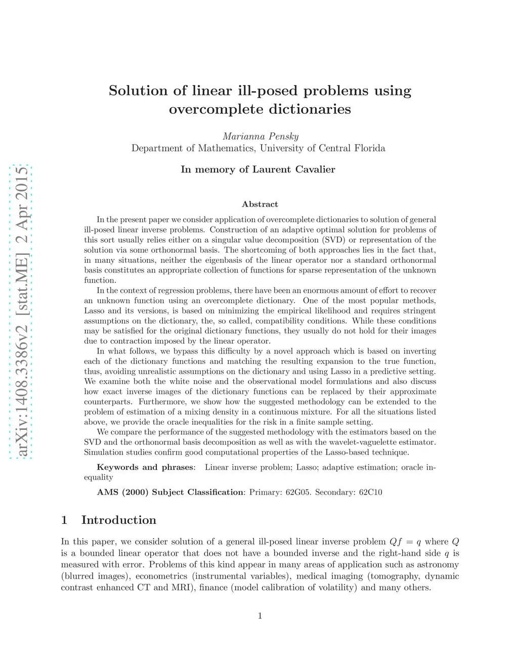 In the present paper we consider application of overcomplete dictionaries to solution of general ill-posed linear inverse problems. Construction of an adaptive optimal solution for such problems usually relies either on a singular value decomposition or representation of the solution via an orthonormal basis. The shortcoming of both approaches lies in the fact that, in many situations, neither the eigenbasis of the linear operator nor a standard orthonormal basis constitutes an appropriate collection of functions for sparse representation of the unknown function. In the context of regression problems, there have been an enormous amount of effort to recover an unknown function using an overcomplete dictionary. One of the most popular methods, Lasso, is based on minimizing the empirical likelihood and requires stringent assumptions on the dictionary, the, so called, compatibility conditions. While these conditions may be satisfied for the original dictionary functions, they usually do not hold for their images due to contraction imposed by the linear operator. In what follows, we bypass this difficulty by a novel approach which is based on inverting each of the dictionary functions and matching the resulting expansion to the true function, thus, avoiding unrealistic assumptions on the dictionary and using Lasso in a predictive setting. We examine both the white noise and the observational model formulations and also discuss how exact inverse images of the dictionary functions can be replaced by their approximate counterparts. Furthermore, we show how the suggested methodology can be extended to the problem of estimation of a mixing density in a continuous mixture. For all the situations listed above, we provide the oracle inequalities for the risk in a finite sample setting. Simulation studies confirm good computational properties of the Lasso-based technique.