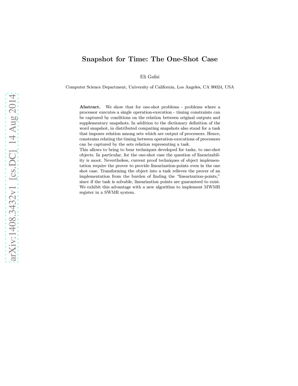 We show that for one-shot problems - problems where a processor executes a single operation-execution - timing constraints can be captured by conditions on the relation between original outputs and supplementary snapshots. In addition to the dictionary definition of the word snapshot, in distributed computing snapshots also stand for a task that imposes relation among sets which are output of processors. Hence, constrains relating the timing between operation-executions of processors can be captured by the sets relation representing a task. This allows to bring to bear techniques developed for tasks, to one-shot objects. In particular, for the one-shot case the question of linearizability is moot. Nevertheless, current proof techniques of object implementation require the prover to provide linearization-points even in the one shot case. Transforming the object into a task relieves the prover of an implementation from the burden of finding the "linearization-points," since if the task is solvable, linearization points are guaranteed to exist. We exhibit this advantage with a new algorithm to implement MWMR register in a SWMR system.